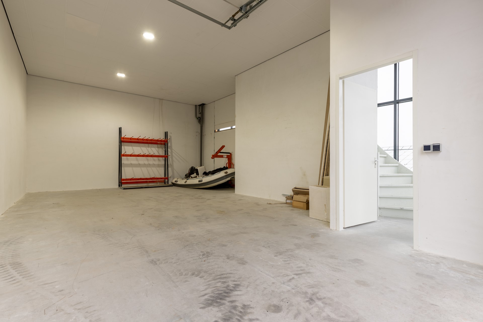 Vanuit de bedrijfsruimte zijn zowel de meterkast als de separate kast/bergruimte bereikbaar. De bedrijfsruimte zelf is rechthoekig van opzet, ruim bemeten en praktisch indeelbaar. Dankzij de elektrische overheaddeur aan de voorzijde is de ruimte geschikt voor opslag, montagewerkzaamheden of lichte bedrijfsactiviteiten.