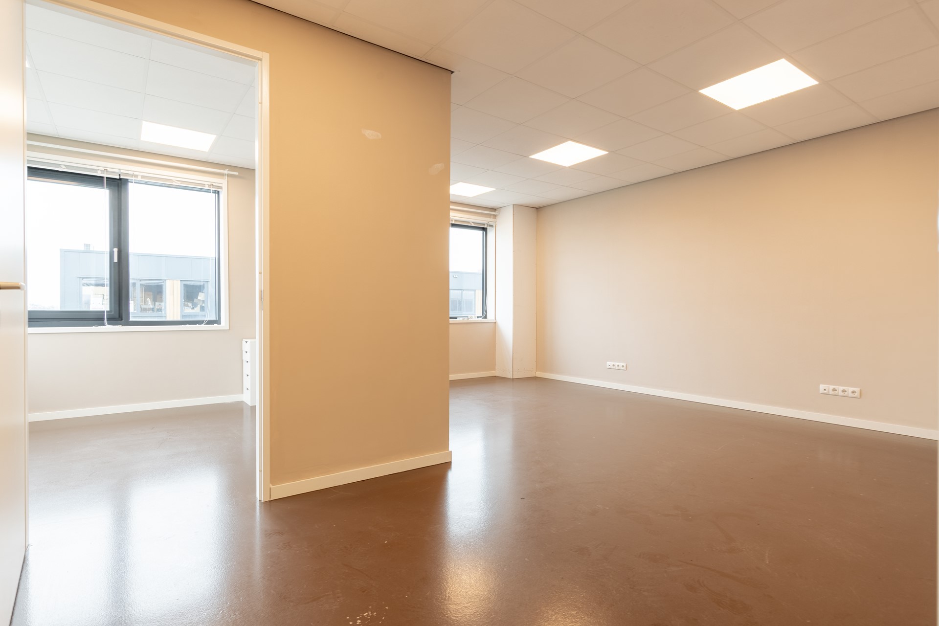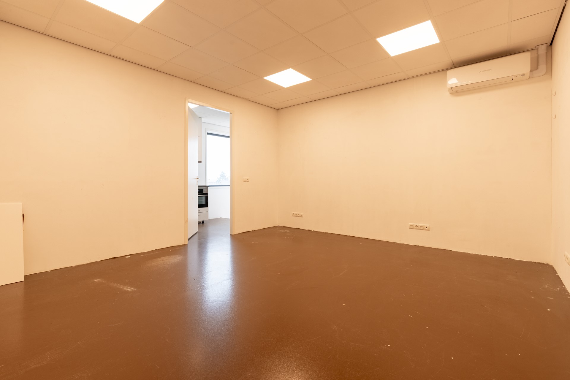 De kantoorruimtes zijn voorzien van een systeemplafond met verlichting en airconditioning, wat zorgt voor een comfortabele werkomgeving.