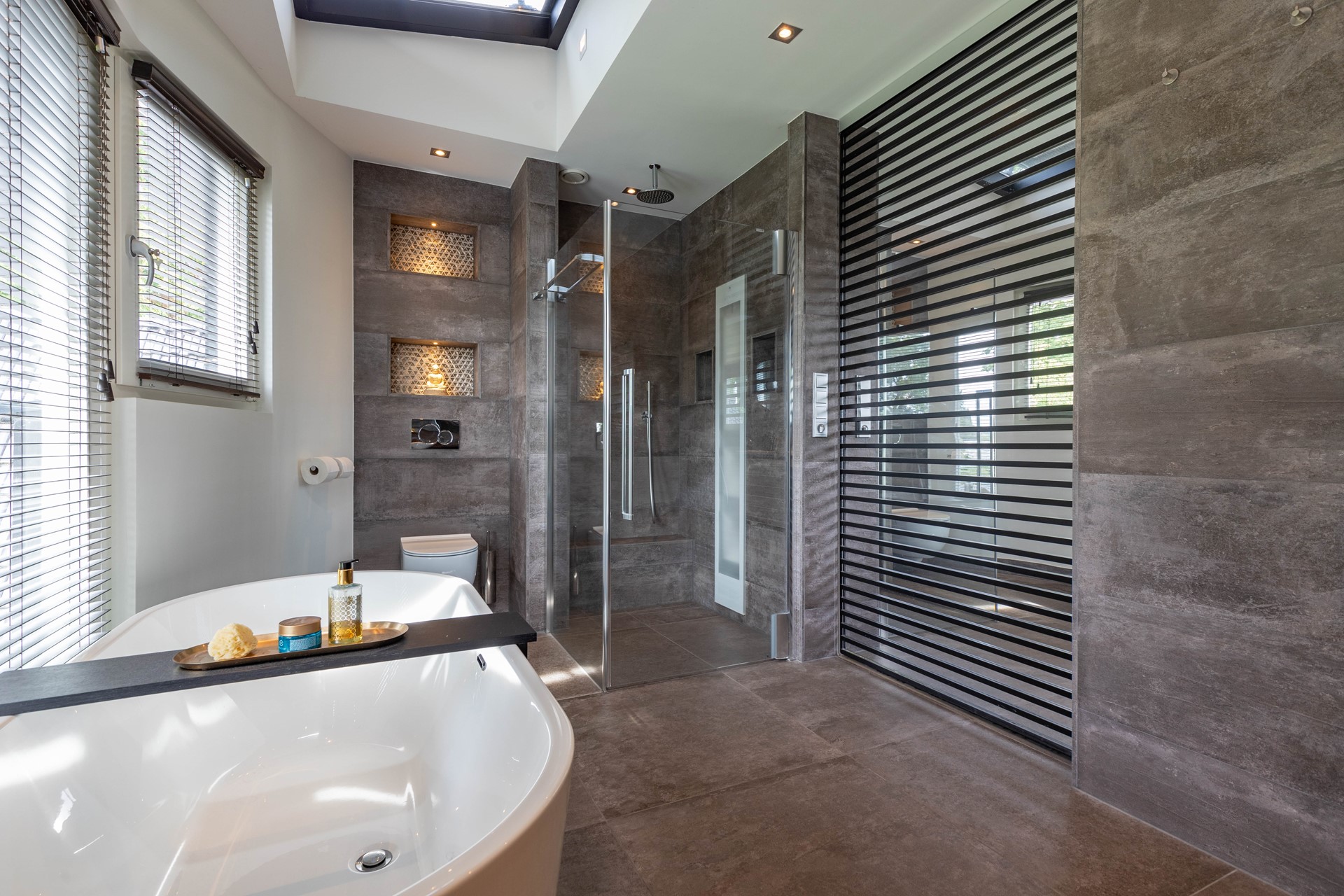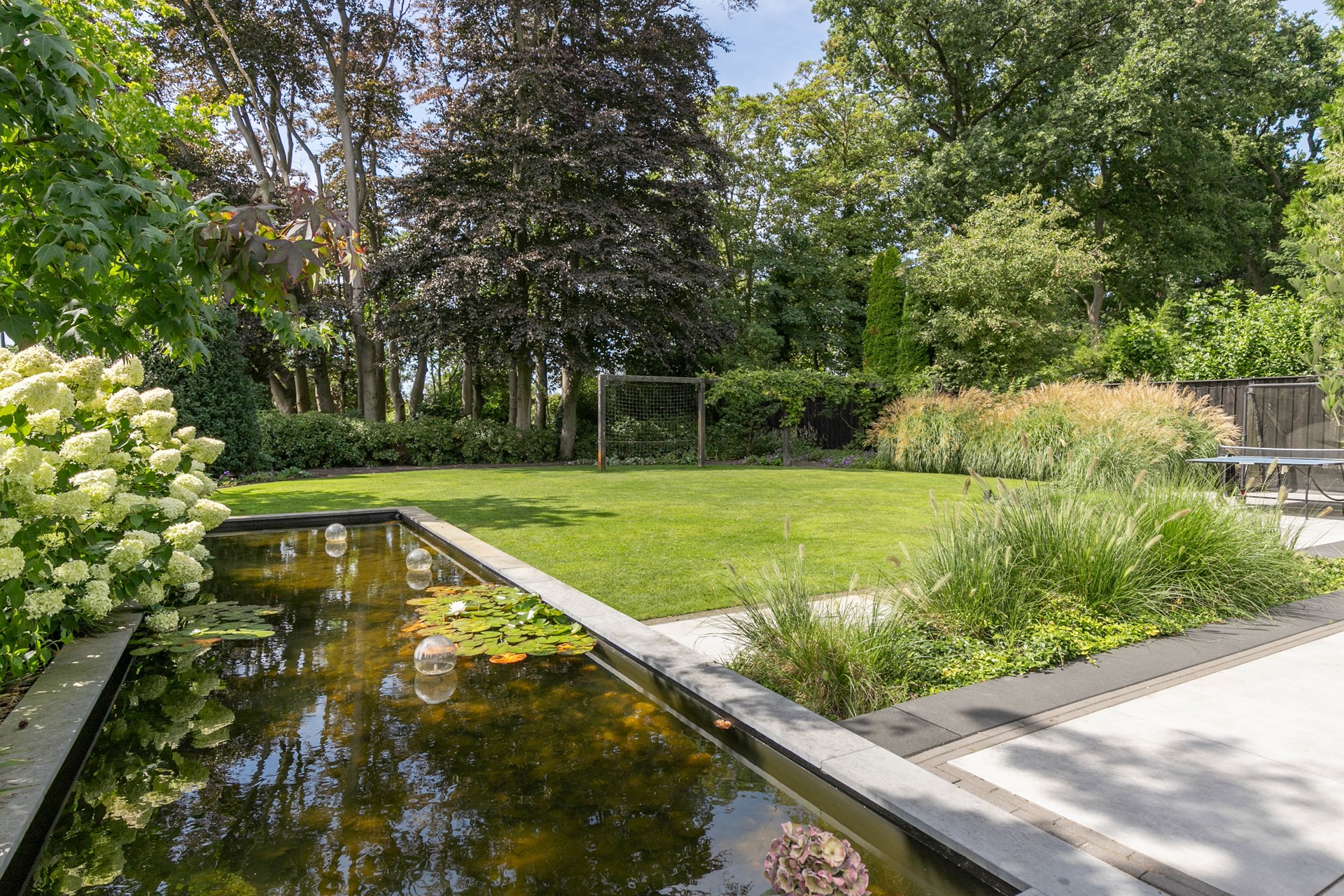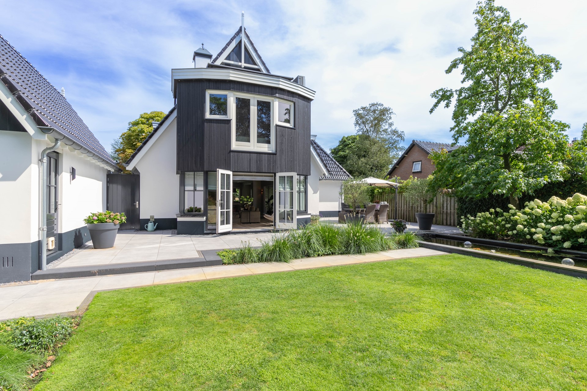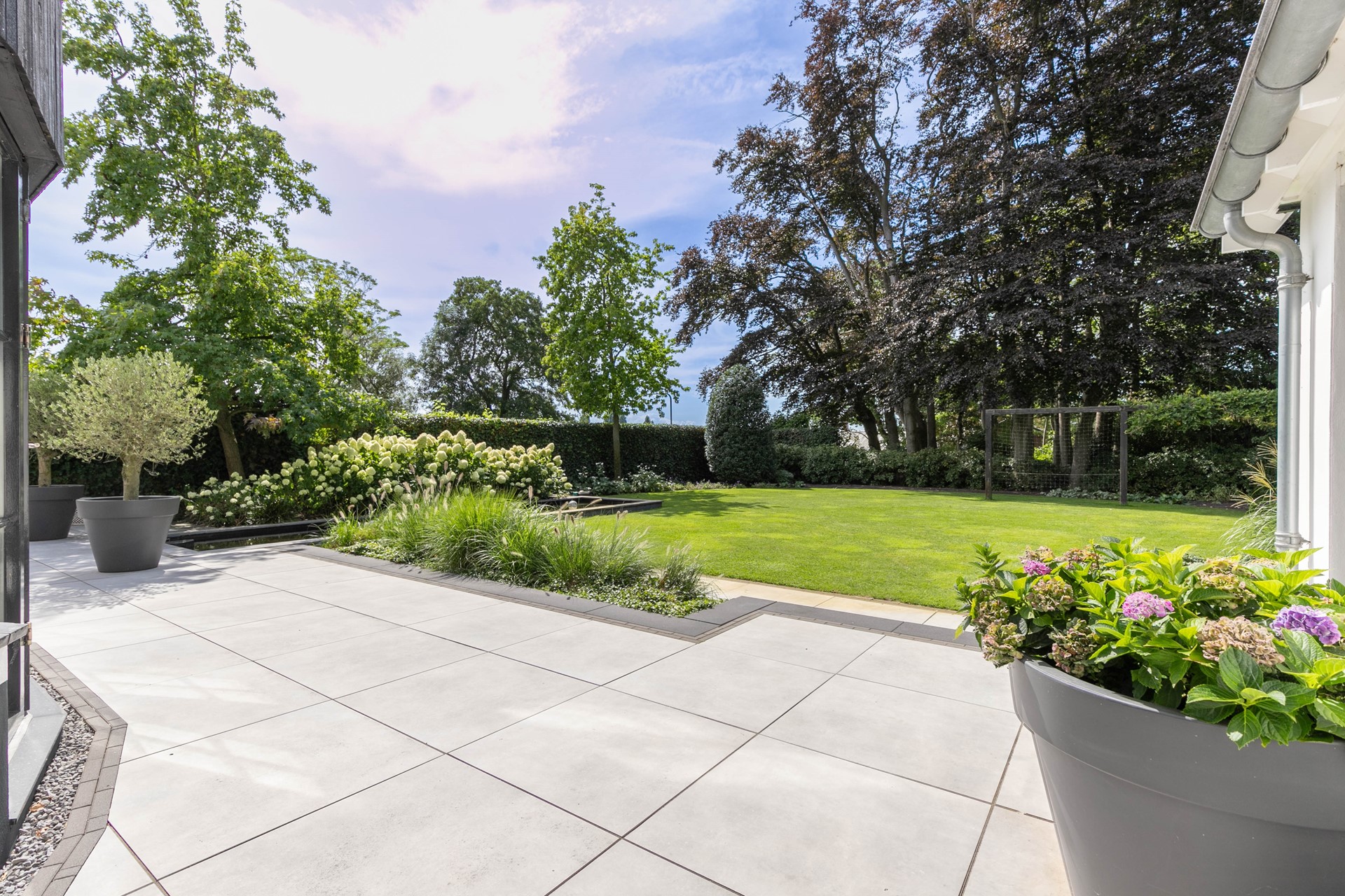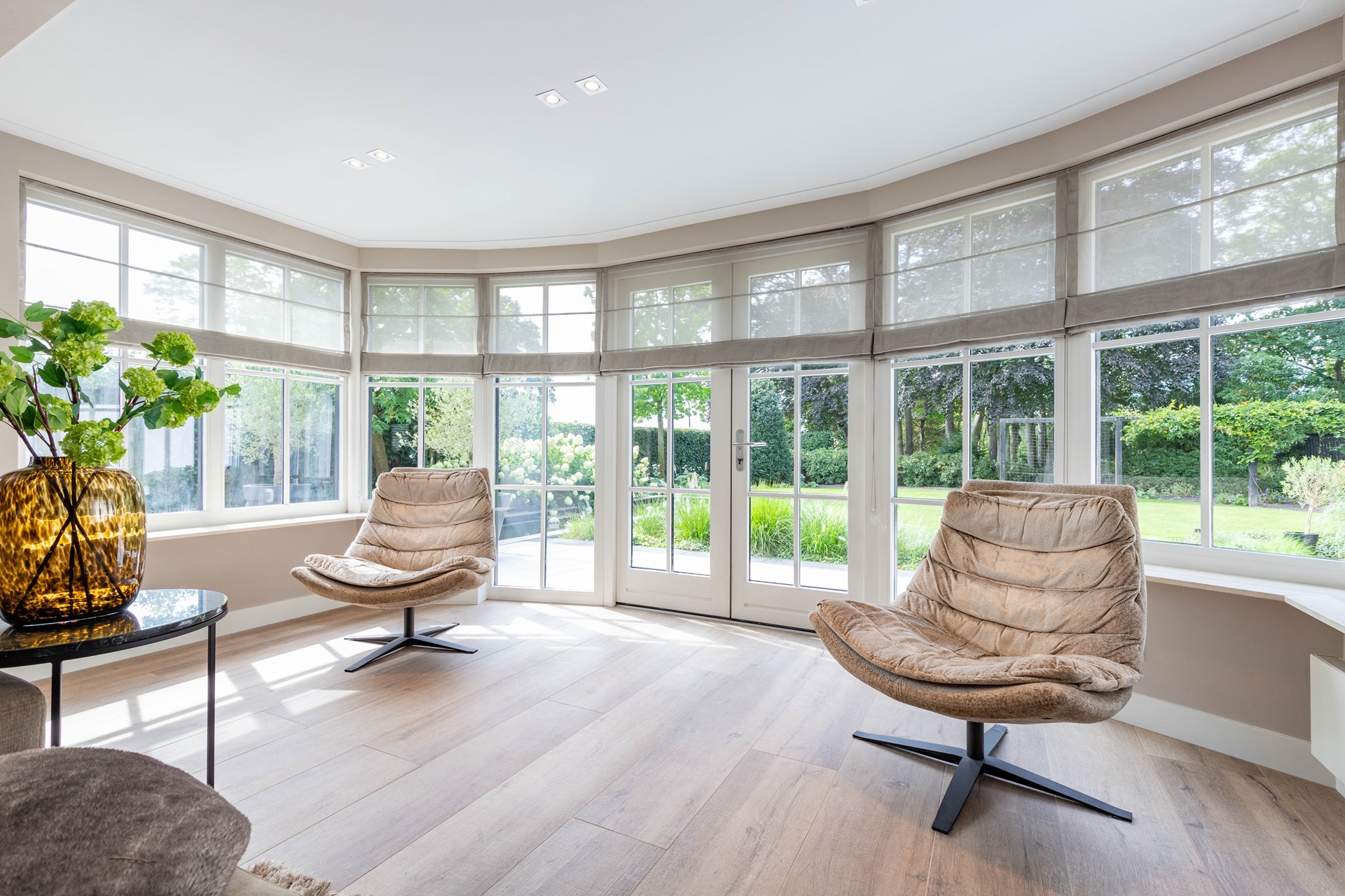 Rondom de villa ligt een perfect onderhouden tuin die volledig is aangelegd onder architectuur. Aan de achterzijde bevindt zich een groot gazon, omgeven door volwassen boompartijen die zorgen voor een groene omlijsting en maximale privacy. De terrassen zijn afgewerkt met luxe bestrating en bieden volop ruimte om in stijl te ontspannen of gasten te ontvangen. Dankzij de ligging op het zuidwesten is er de hele dag door zon, terwijl de oude bomen ook voldoende natuurlijke schaduw creëren. De combinatie van strakke lijnen, hoogwaardige materialen en weelderige natuur maakt de tuin een verlengstuk van de woning. Naast de tuin beschikt het perceel over een vrijstaande garage en een royale oprit met plaats voor meerdere auto’s.