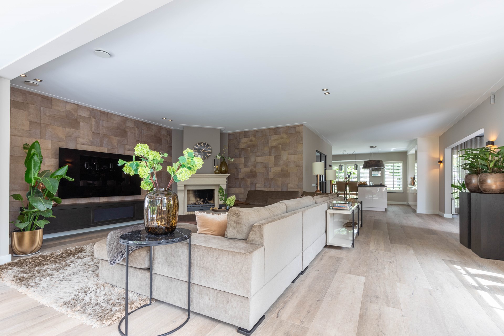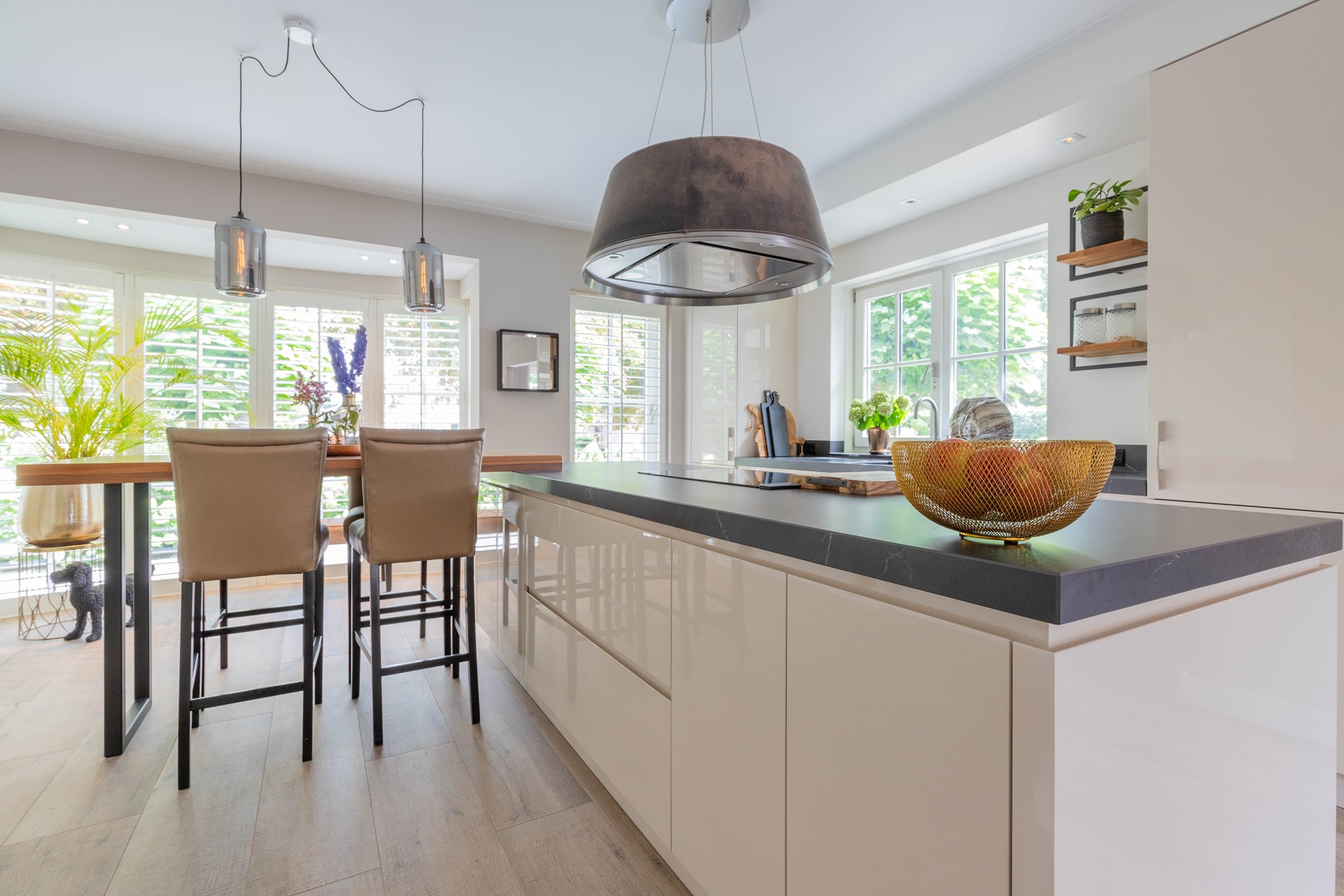zijn een toiletruimte en de fraaie dubbele taats deuren naar de living bereikbaar. De royale woonkamer beschikt over dubbele openslaande deuren naar de tuin en sluit naadloos aan op de eetkamer, eveneens met toegang tot het terras. Het geheel is ingericht door de interieurstylist Sam Veerman, wie ervoor gezorgd heeft dat alles naadloos in elkaar overloopt en het geheel een prachtige uitstraling heeft(inrichting ter overname). De stijlvolle keuken is voorzien van diverse luxe inbouwapparatuur en grenst aan de praktische bijkeuken met eigen toegang tot de voortuin.