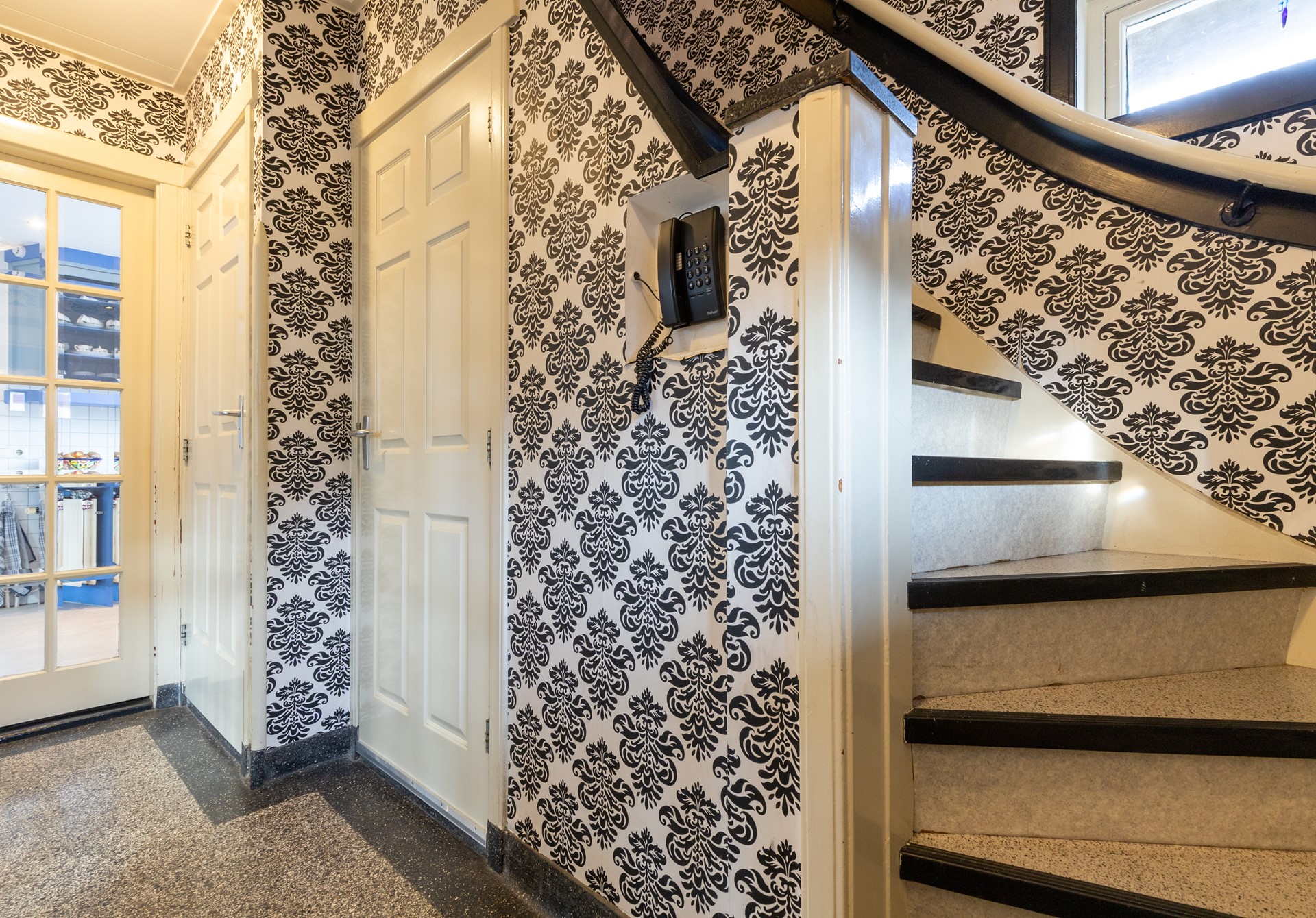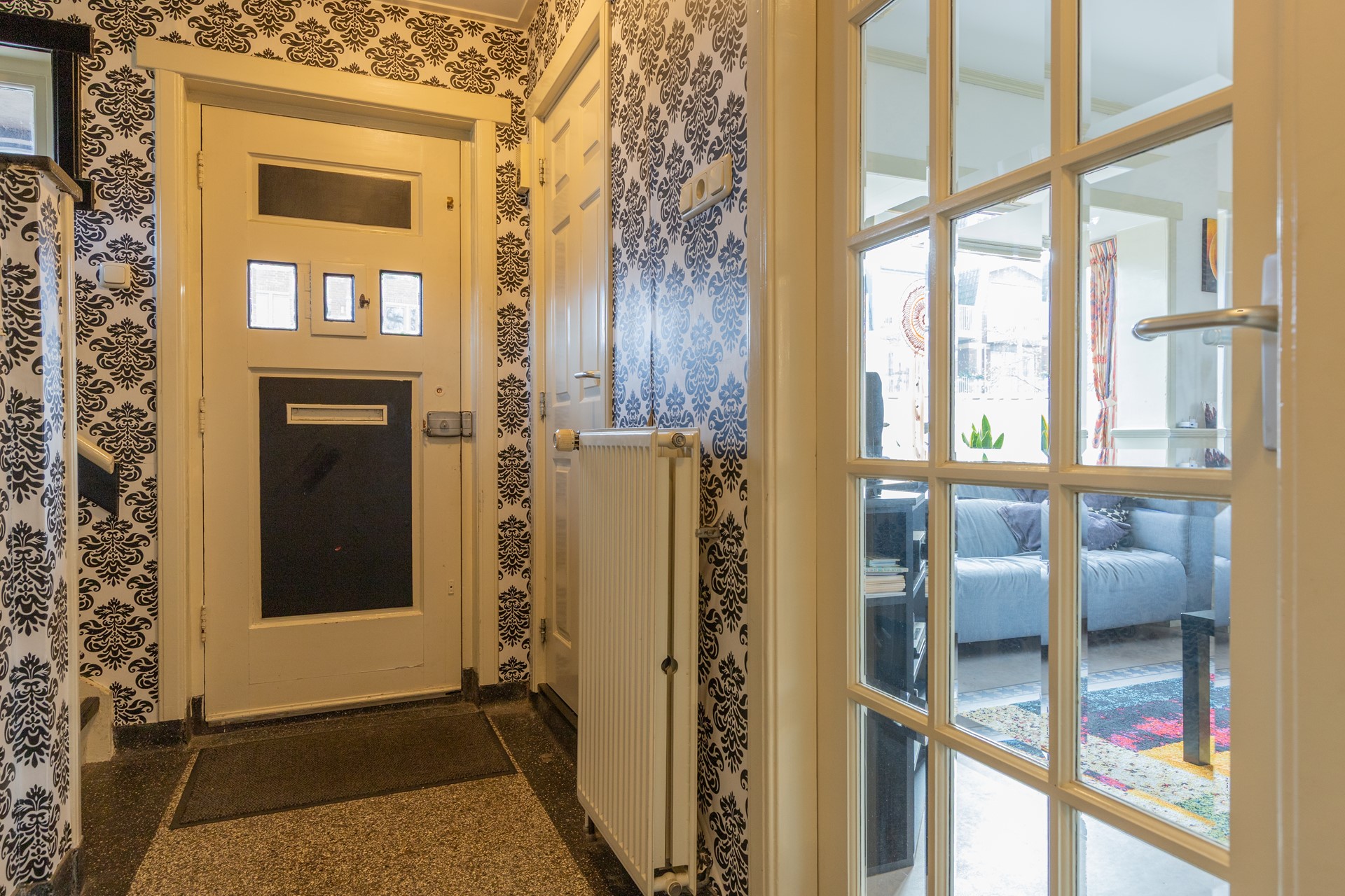 Bij binnenkomst in de woning komt u in de hal, die direct opvalt door de fraaie granito vloer. Vanuit hier heeft u toegang tot de toiletruimte, de trapopgang naar de eerste verdieping, de kelder en de deuren naar zowel de woonkamer als de keuken.