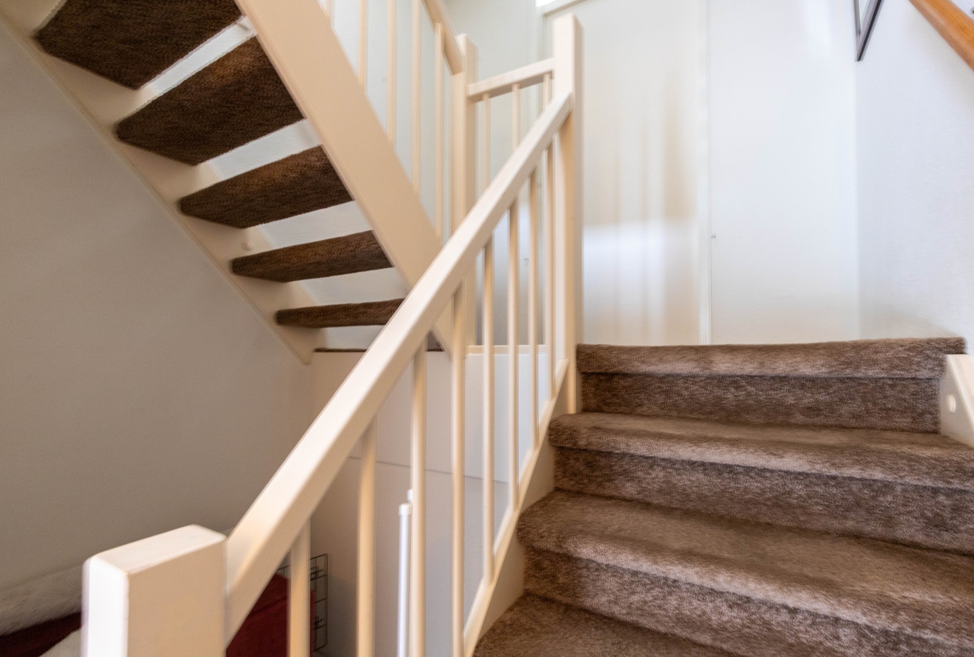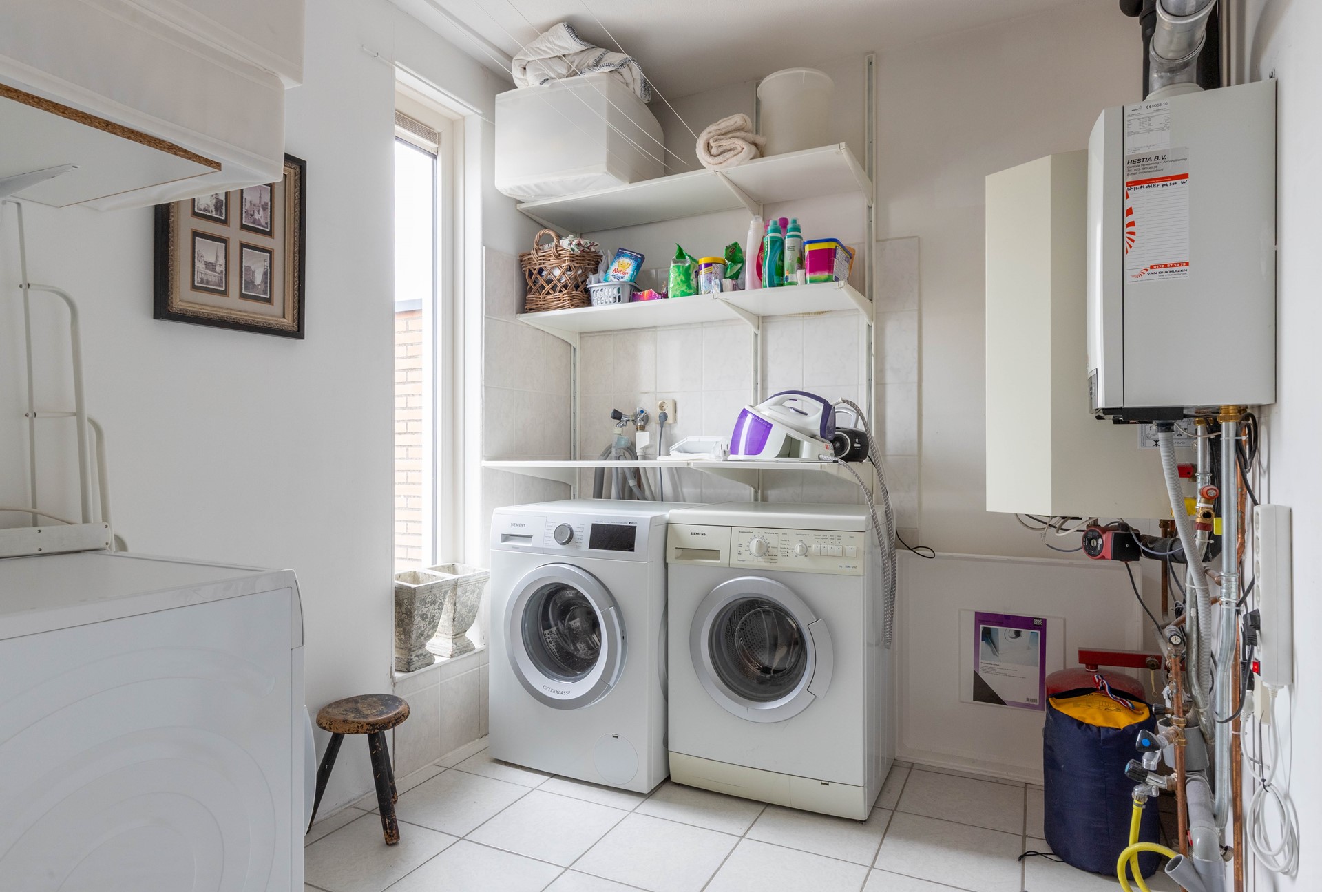 Op de bovenste verdieping zijn twee slaapkamers aan de achterzijde. Op de vloer weer de vloerbedekking. Door de ruime overstek aan de achterzijde een beschutte ligging. Aan de voorzijde is de technische ruimte. Hier is de zonneboiler, aansluiting voor de wasmachine en droger, de c.v. (Nefit 2010) en de mechanische ventilatie. De c.v. is elk jaar onderhouden.