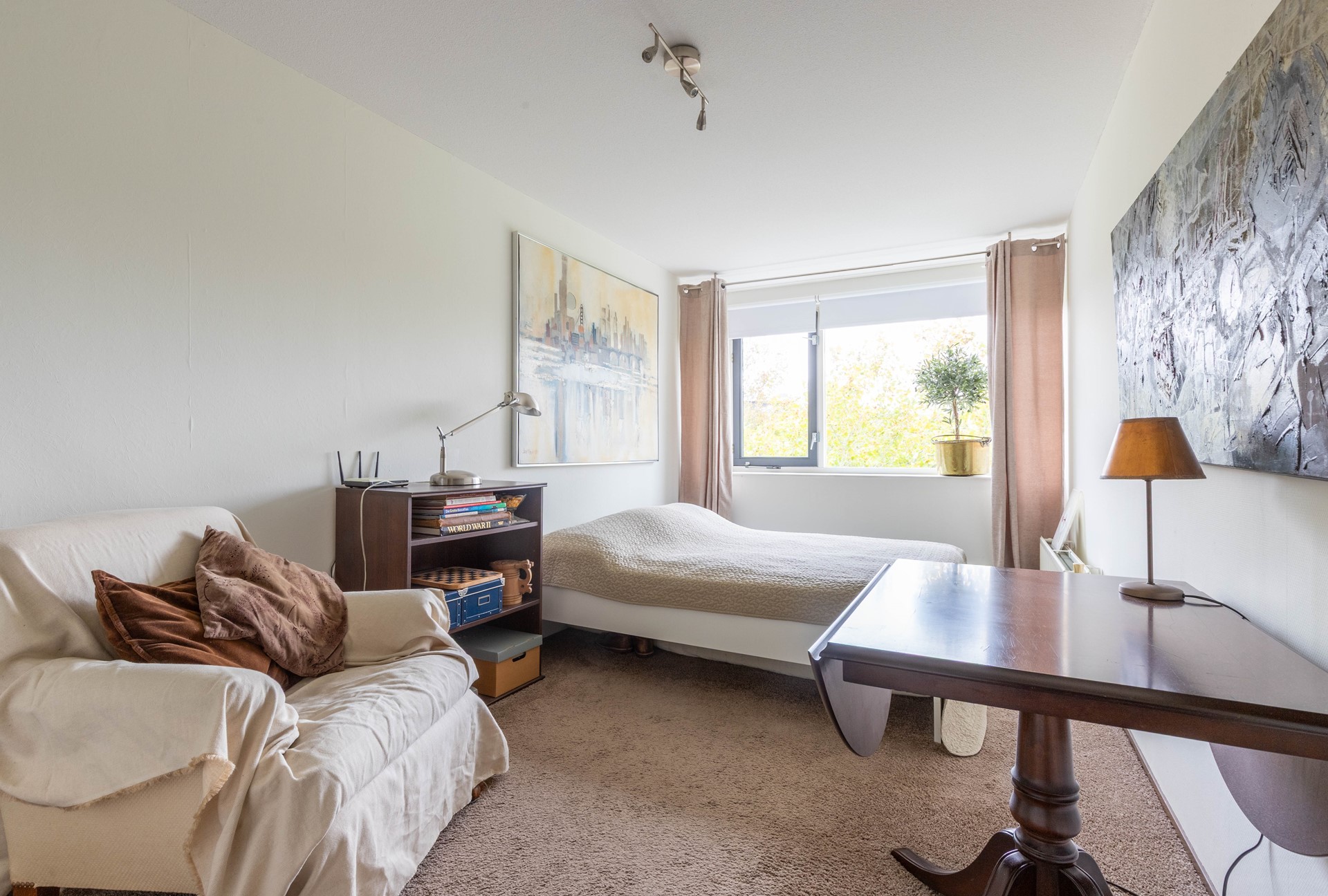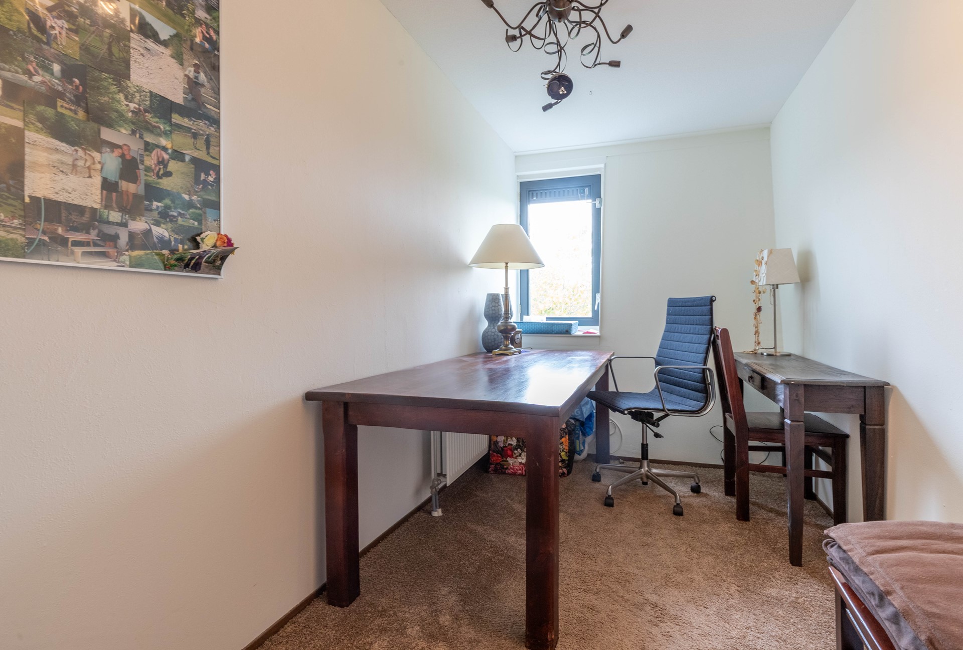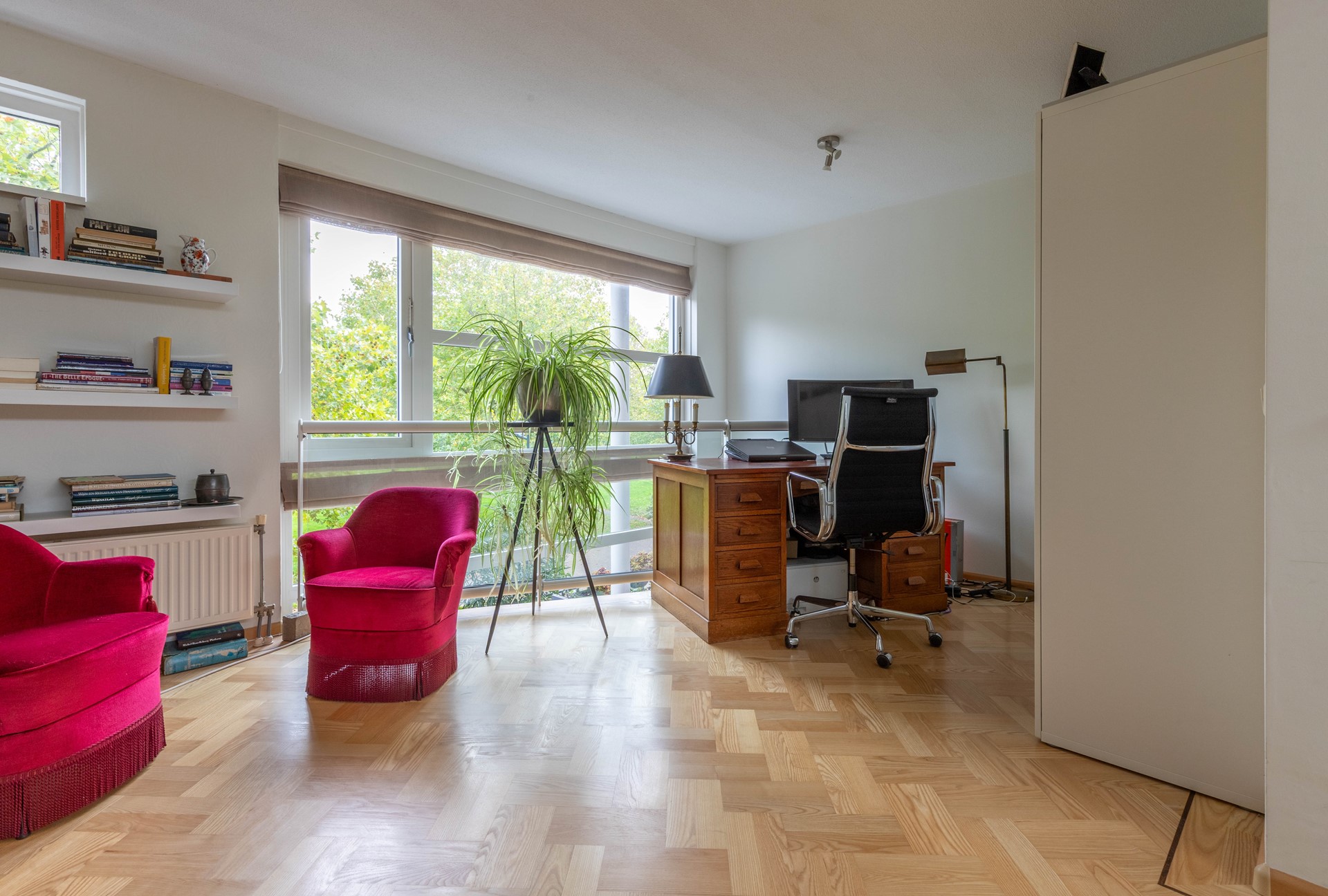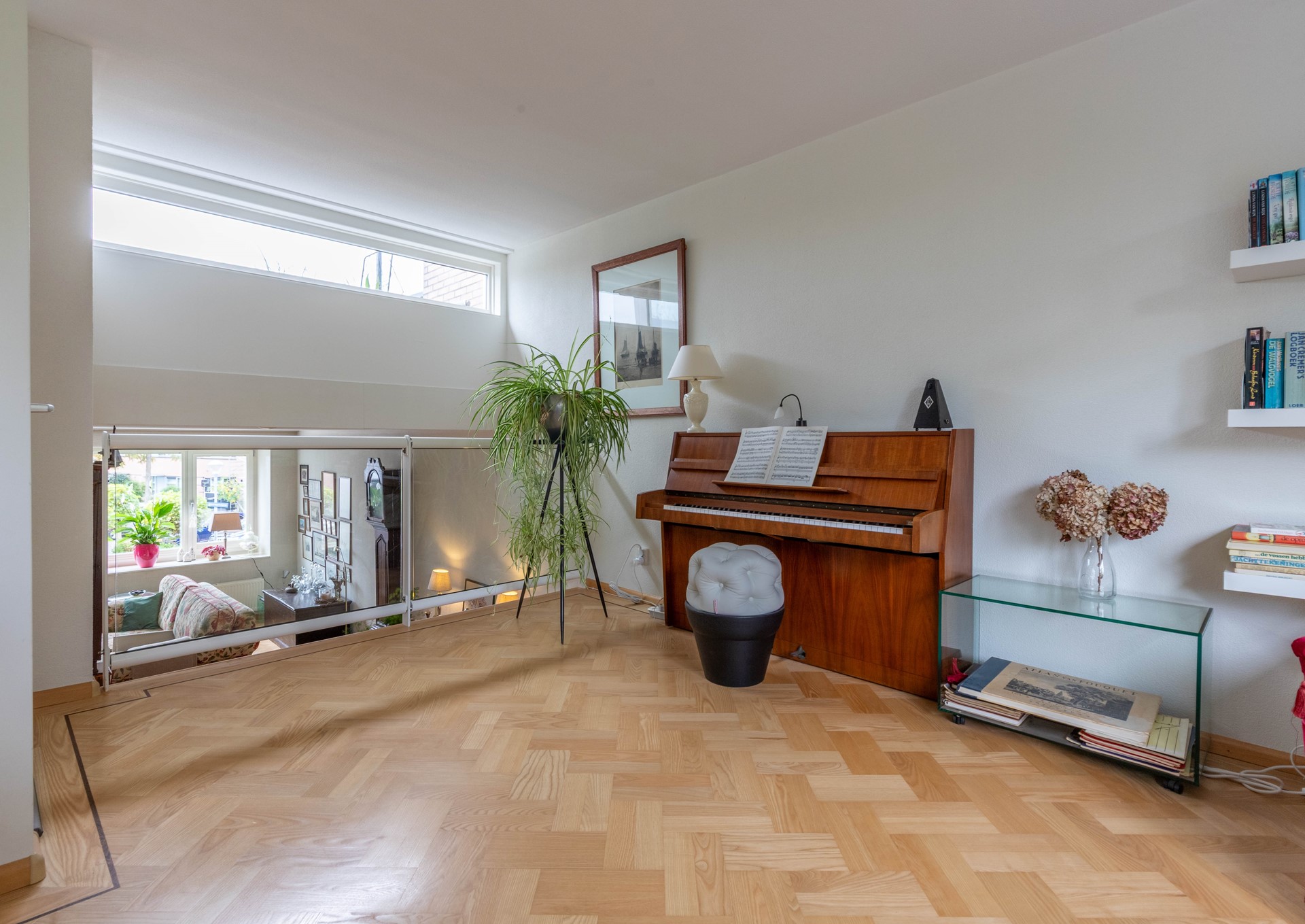 De videkamer schuin boven de woonkamer is een praktische ruimte. Inzetbaar als televisiekamer, werkkamer of eventueel te verbouwen naar slaapkamer. De kamer heeft aan de achterzijde connectie met de ondergelegen keuken. Vanuit deze kamer heeft u mooi uitzicht over park achter de woning. Ook deze kamer heeft een houten vloer in visgraat motief. De op de foto's aanwezige piano is overigens ter overname.