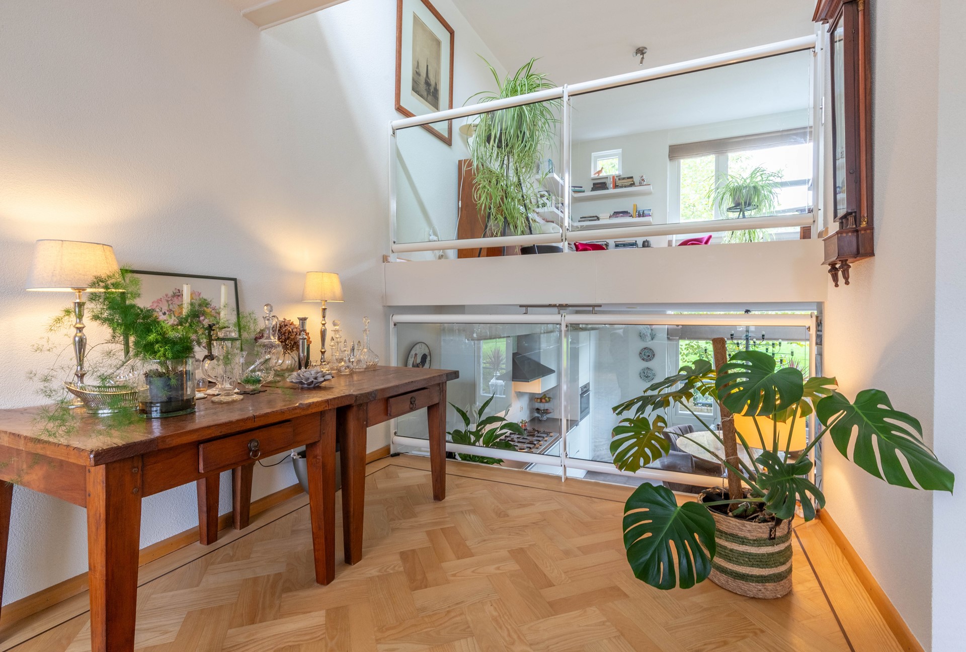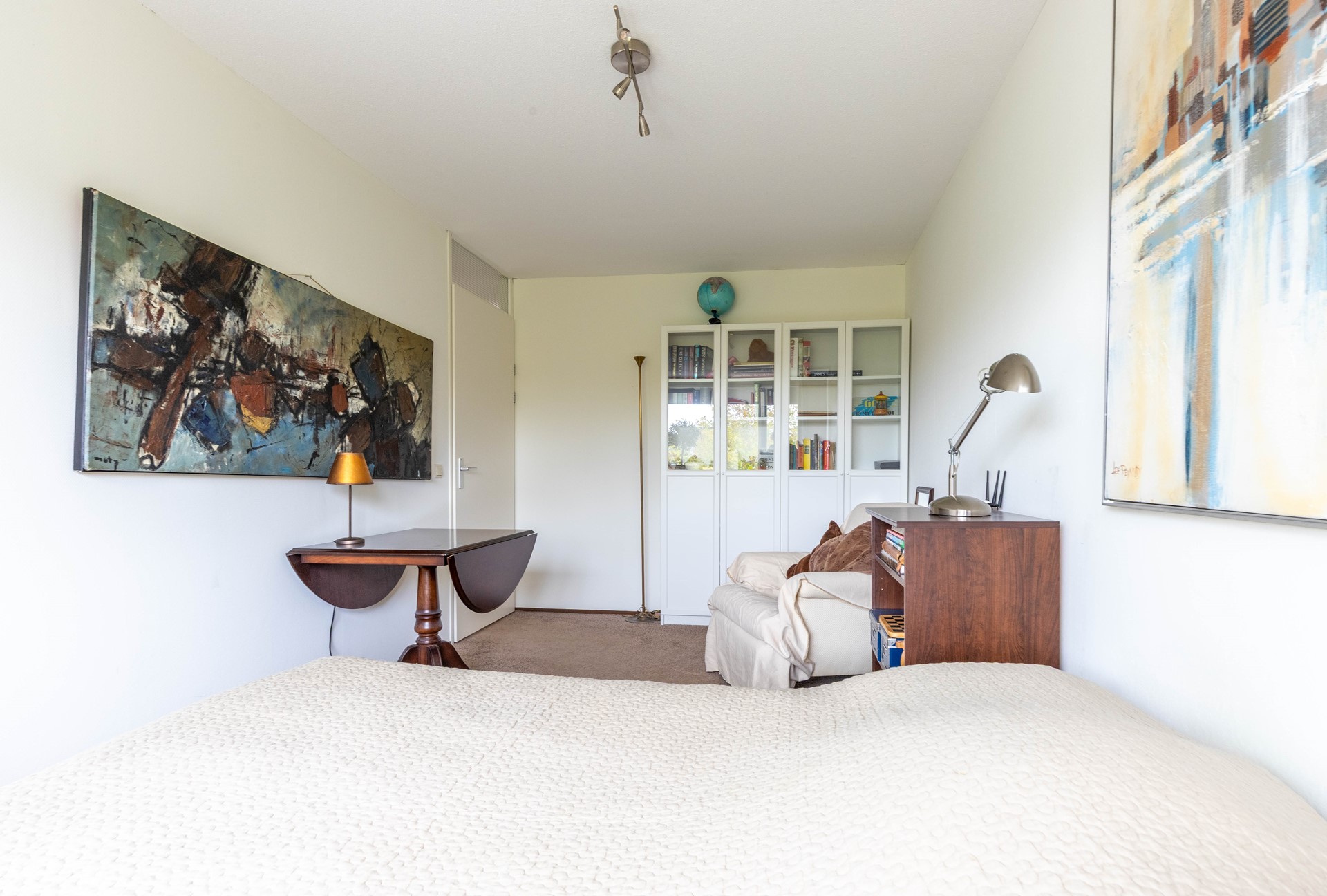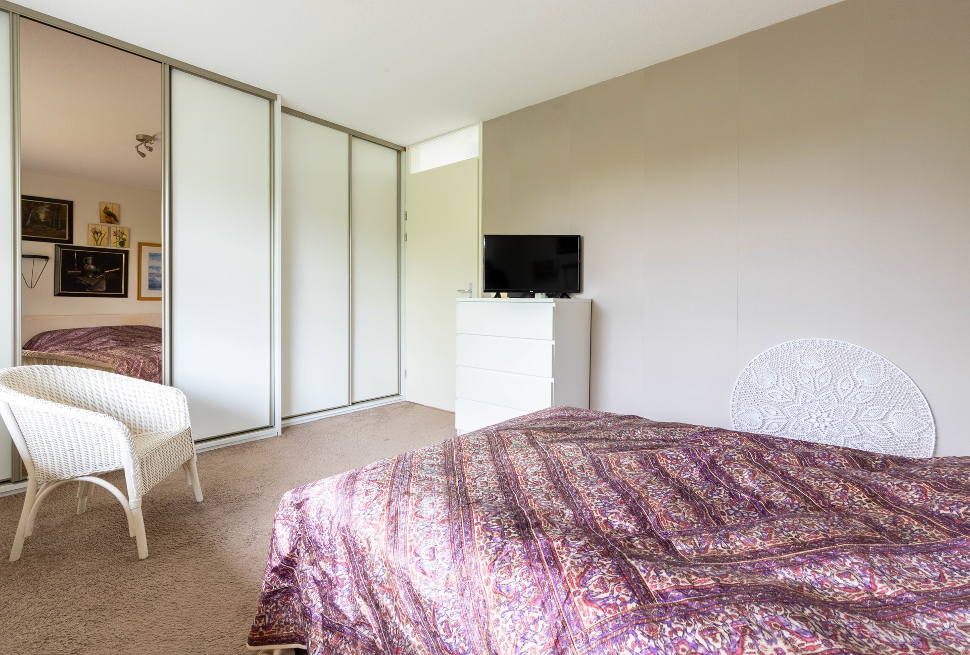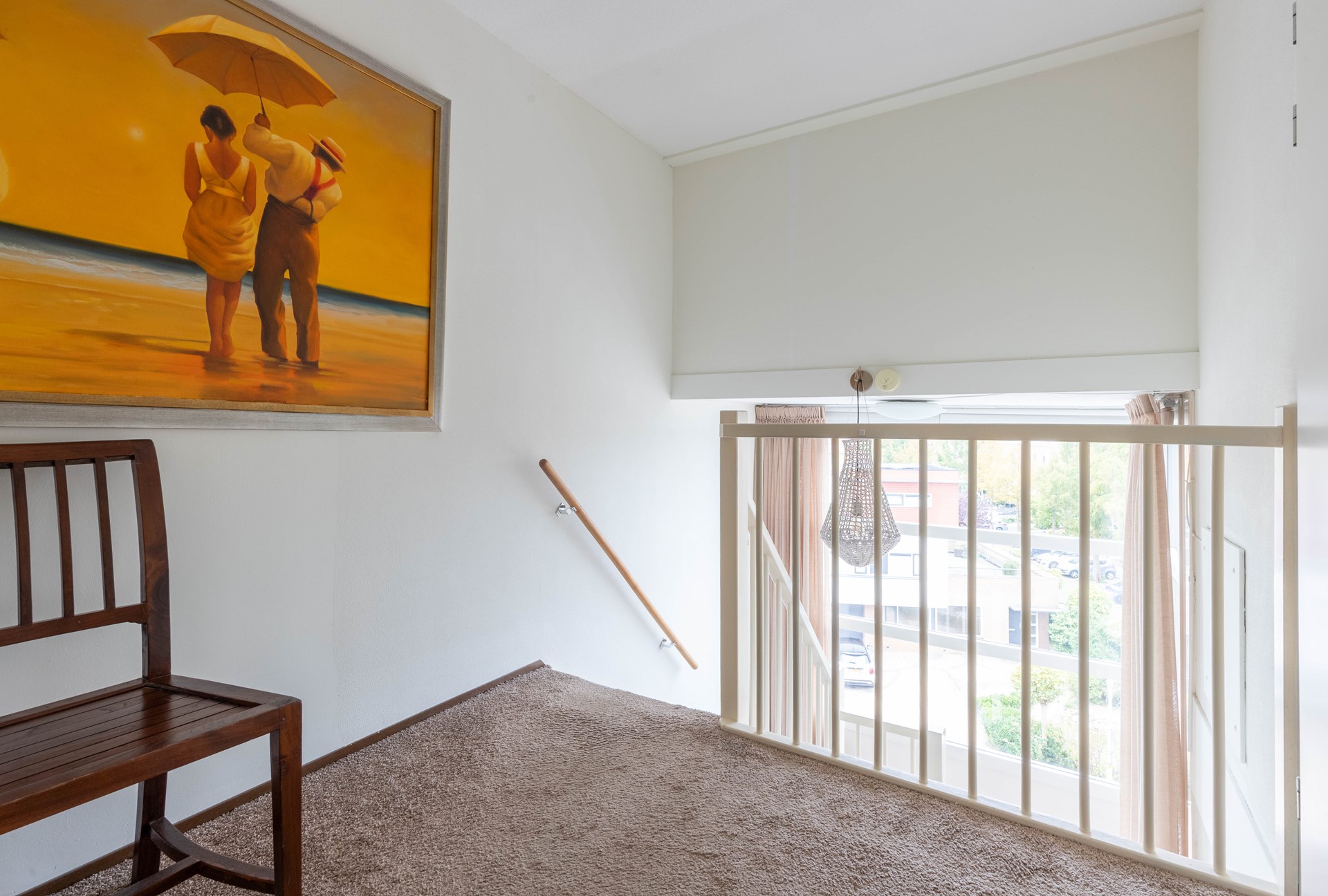 De videkamer schuin boven de woonkamer is een praktische ruimte. Inzetbaar als televisiekamer, werkkamer of eventueel te verbouwen naar slaapkamer. De kamer heeft aan de achterzijde connectie met de ondergelegen keuken. Vanuit deze kamer heeft u mooi uitzicht over park achter de woning. Ook deze kamer heeft een houten vloer in visgraat motief. De op de foto's aanwezige piano is overigens ter overname.