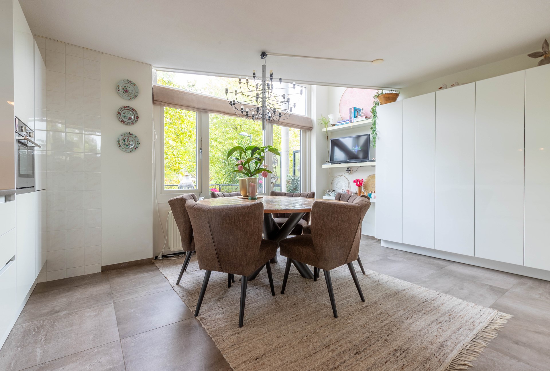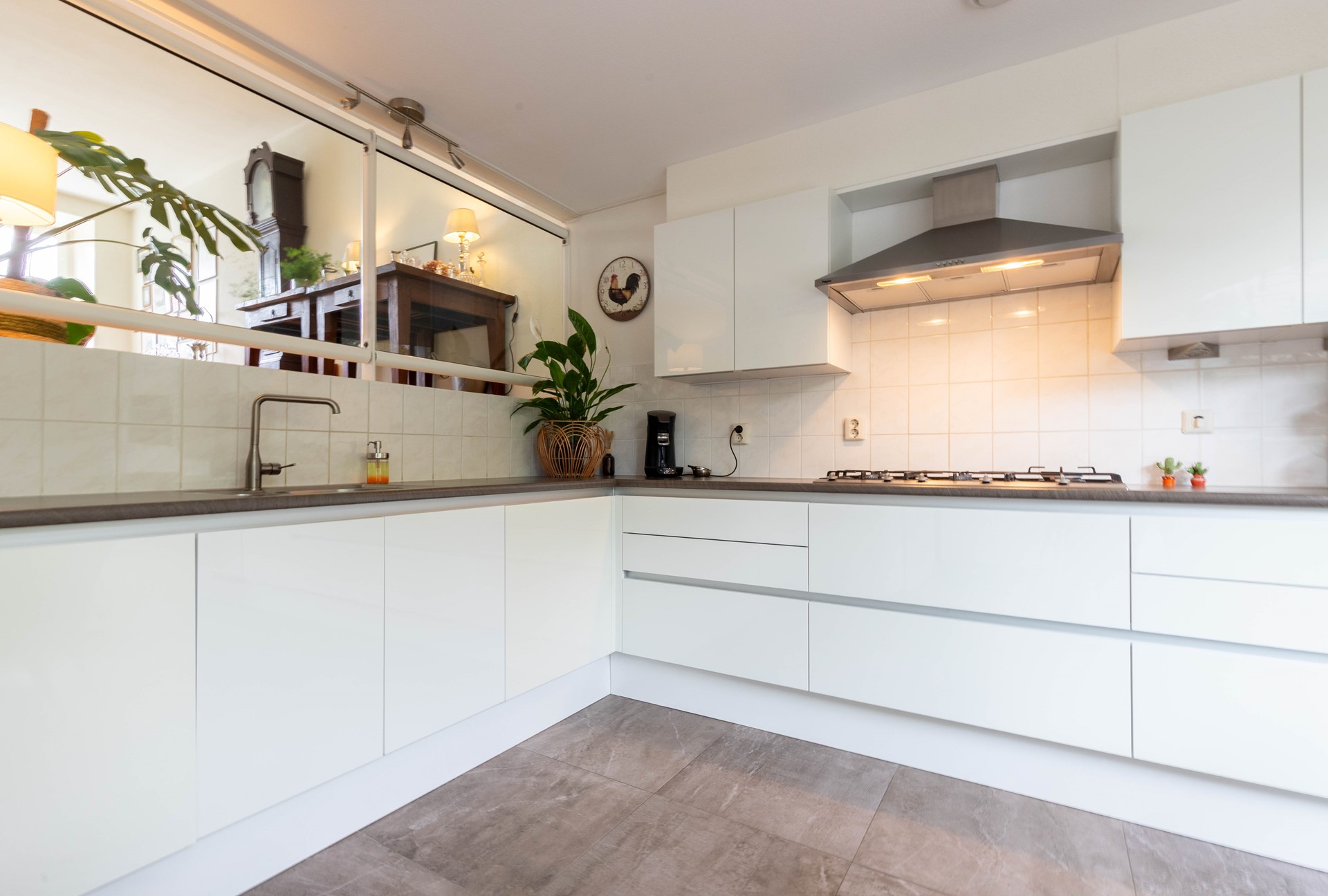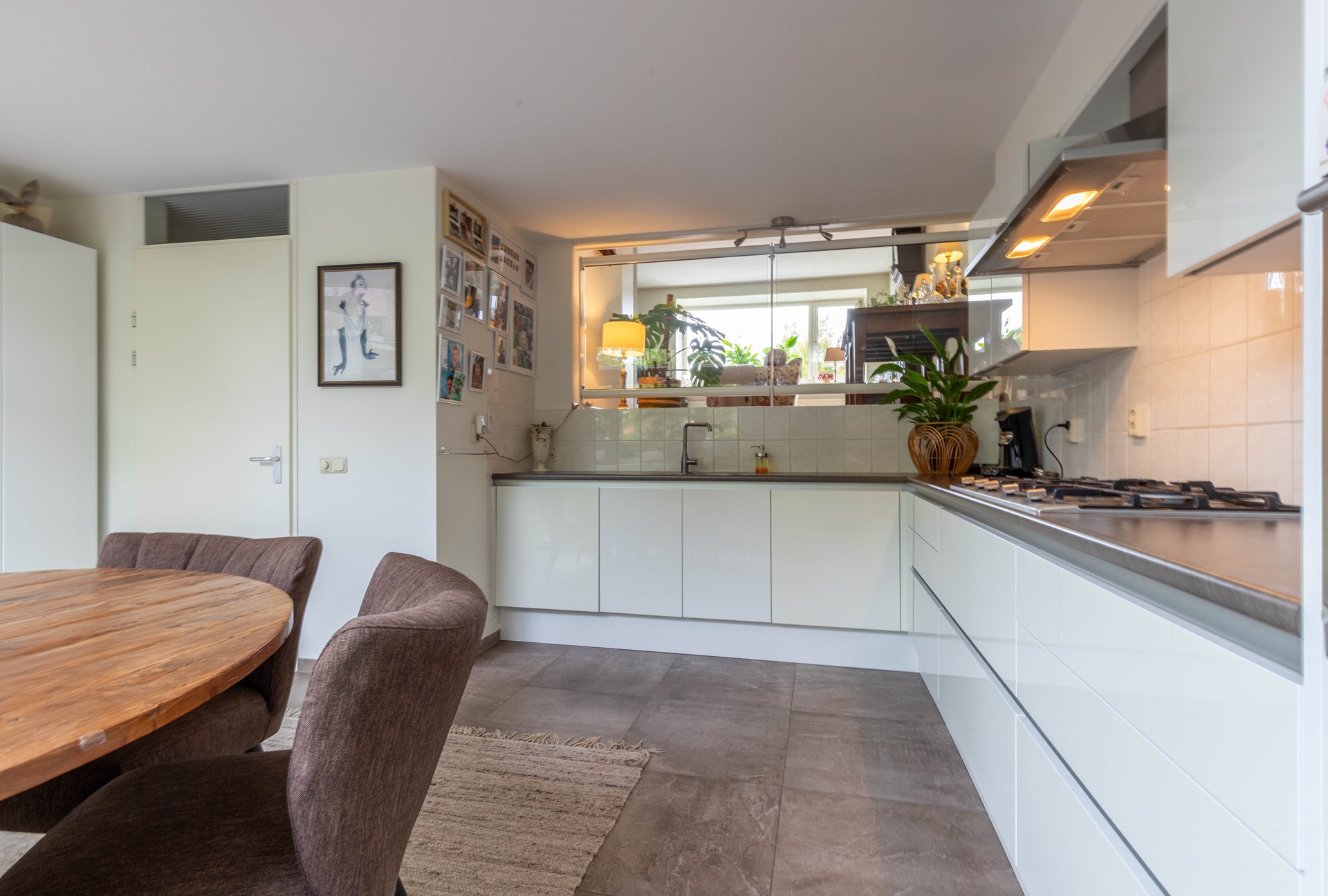 De eerste verdieping is opgesplitst in twee levels, de keuken en de woonkamer. Hier is genoeg ruimte voor een grote eettafel dus een echte woonkeuken. De keuken is uitgerust met onder meer een 5 pits gastoestel, vaatwasser, combi oven/magnetron, 10 liter boiler en een koel-/vriescombinatie. Er is toegang tot het rustig gelegen terras aan de achterzijde. Door de split level indeling is er aan de raamkant een vide naar de bovenliggend kamer. Aan de andere zijde is er een doorkijkje naar de woonkamer. De L-vormige woonkamer is ruim en licht en geeft op zijn beurt ook weer een doorkijk naar de hoger gelegen werkkamer boven de keuken. De keuken heeft een plavuizen vloer, de woonkamer een houten vloer in visgraat patroon gelegd.