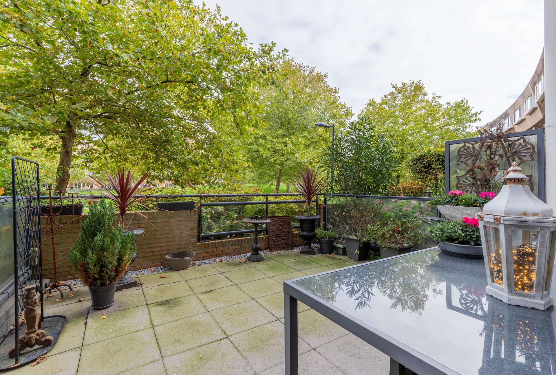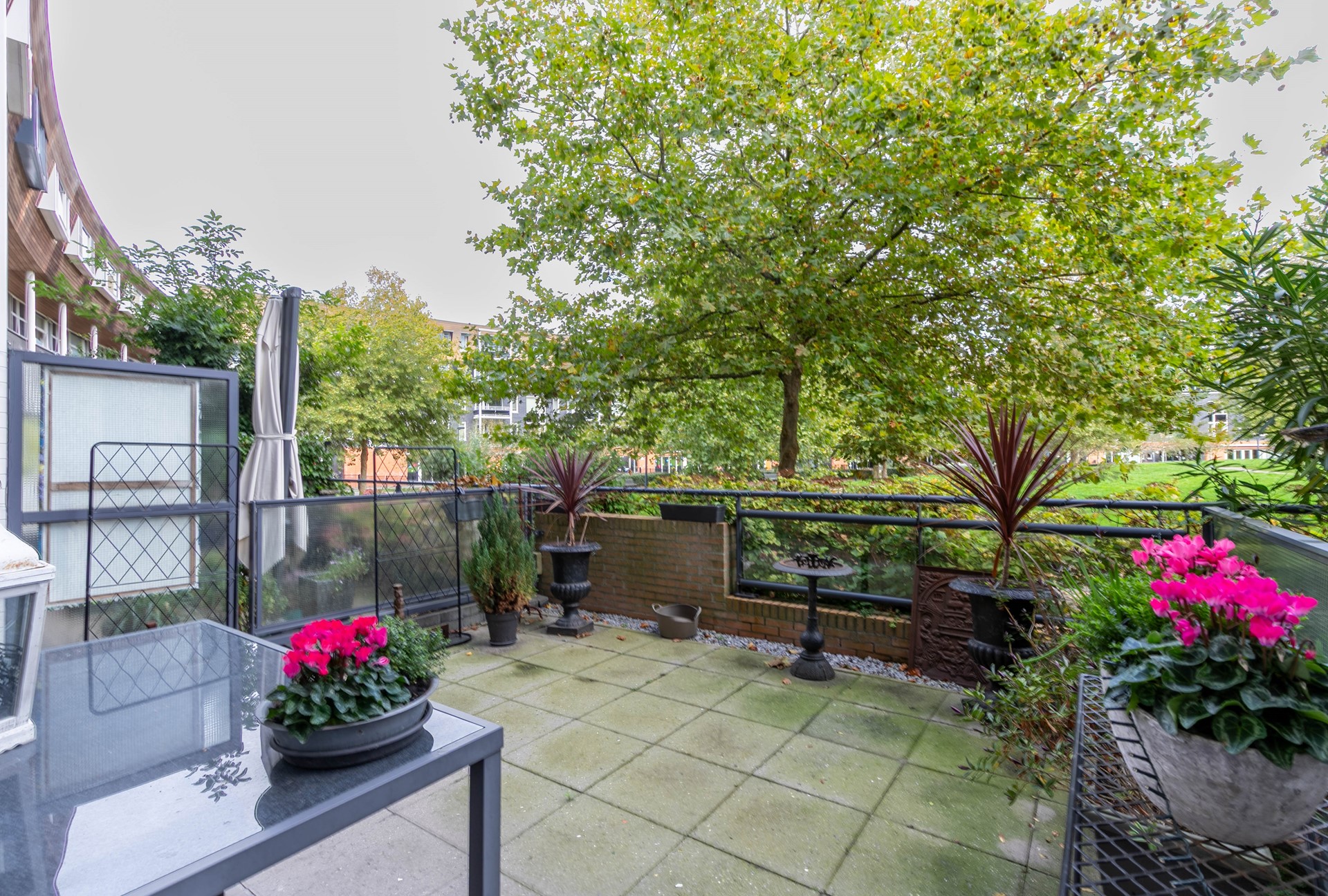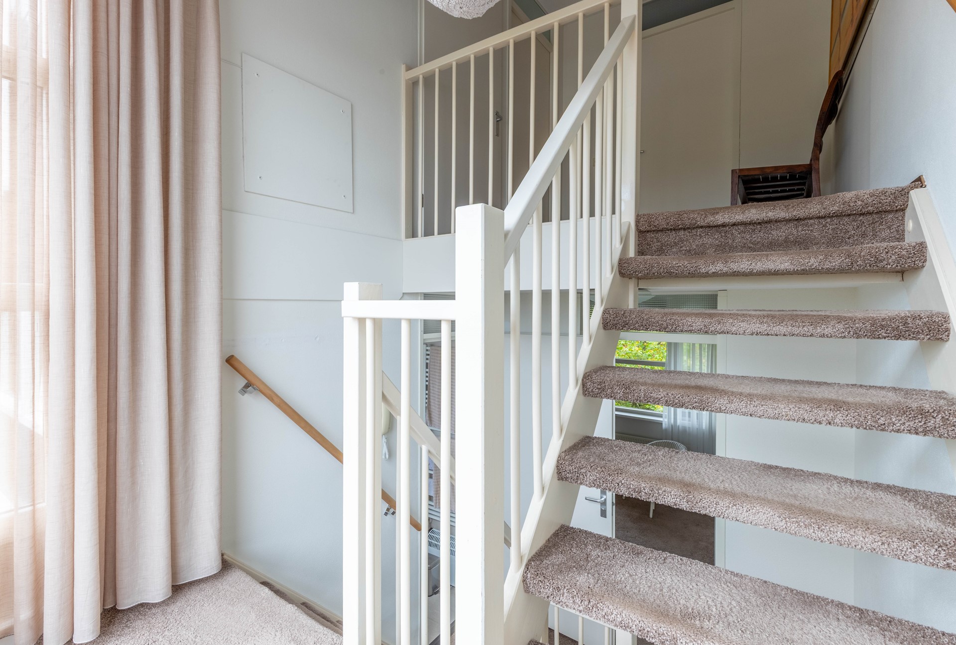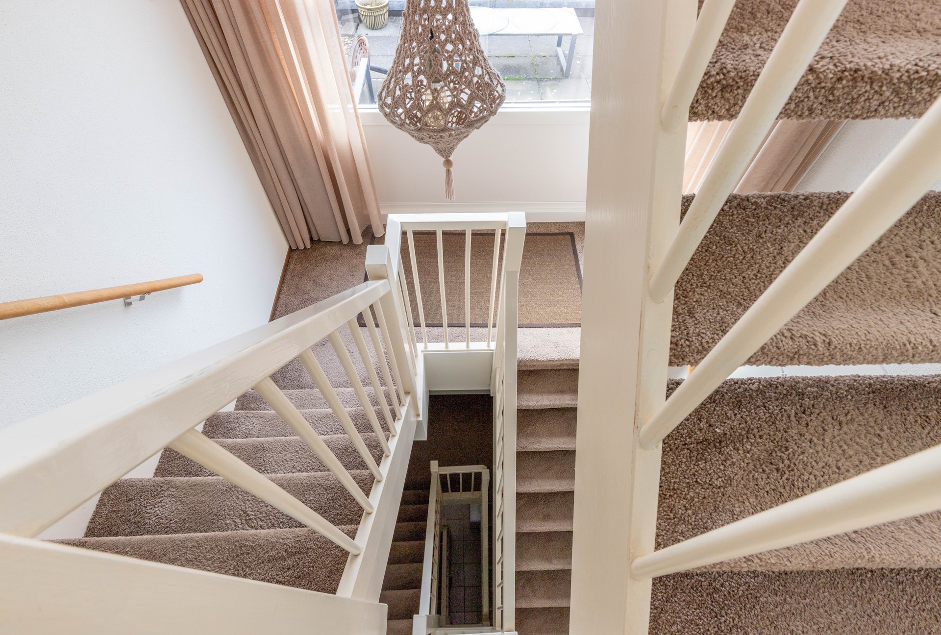 Via het trappenhuis komt u op de volgende laag, het dakterras aan de voorzijde van de woning. Deze ligt op het westen en dus heerlijk op de zon.