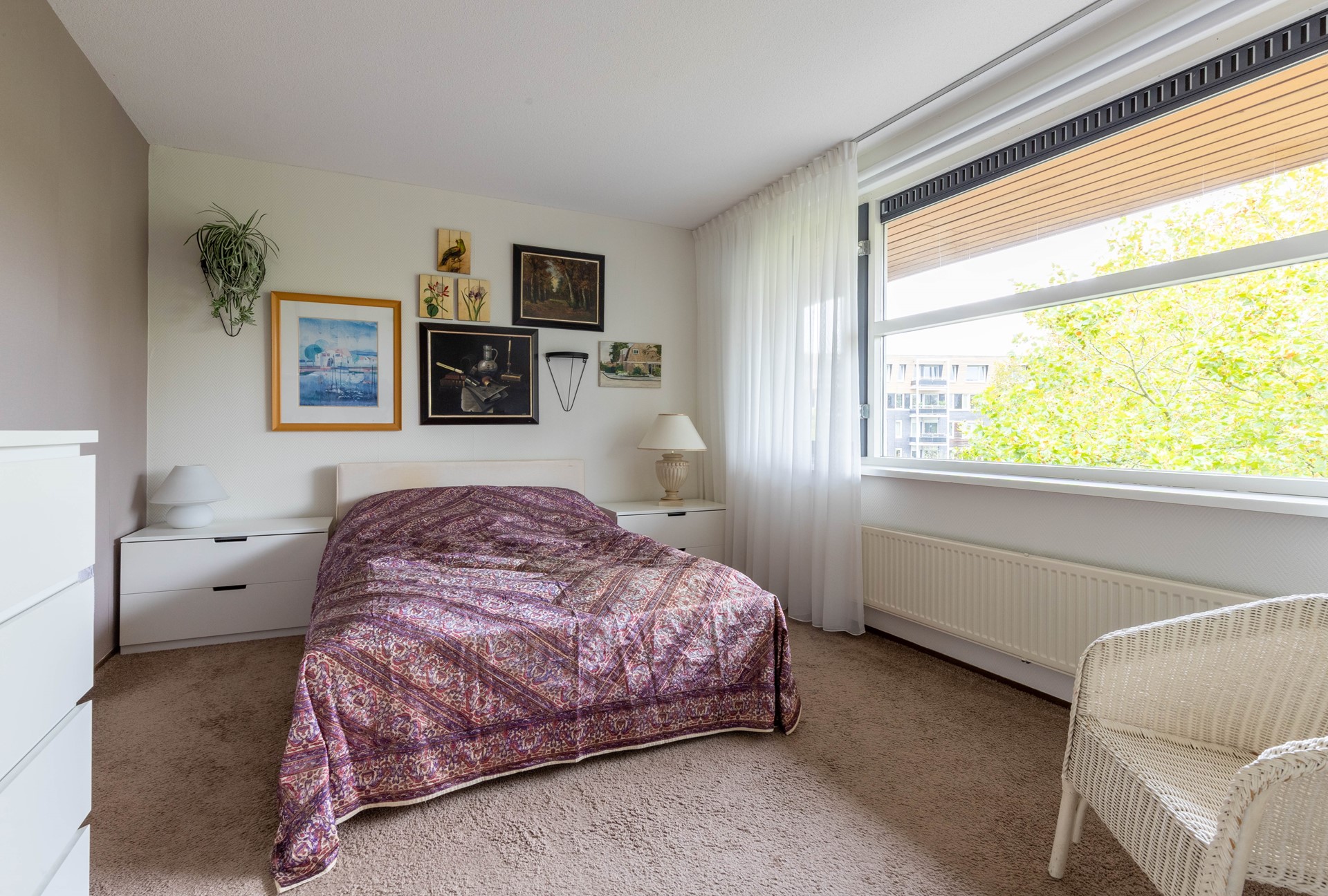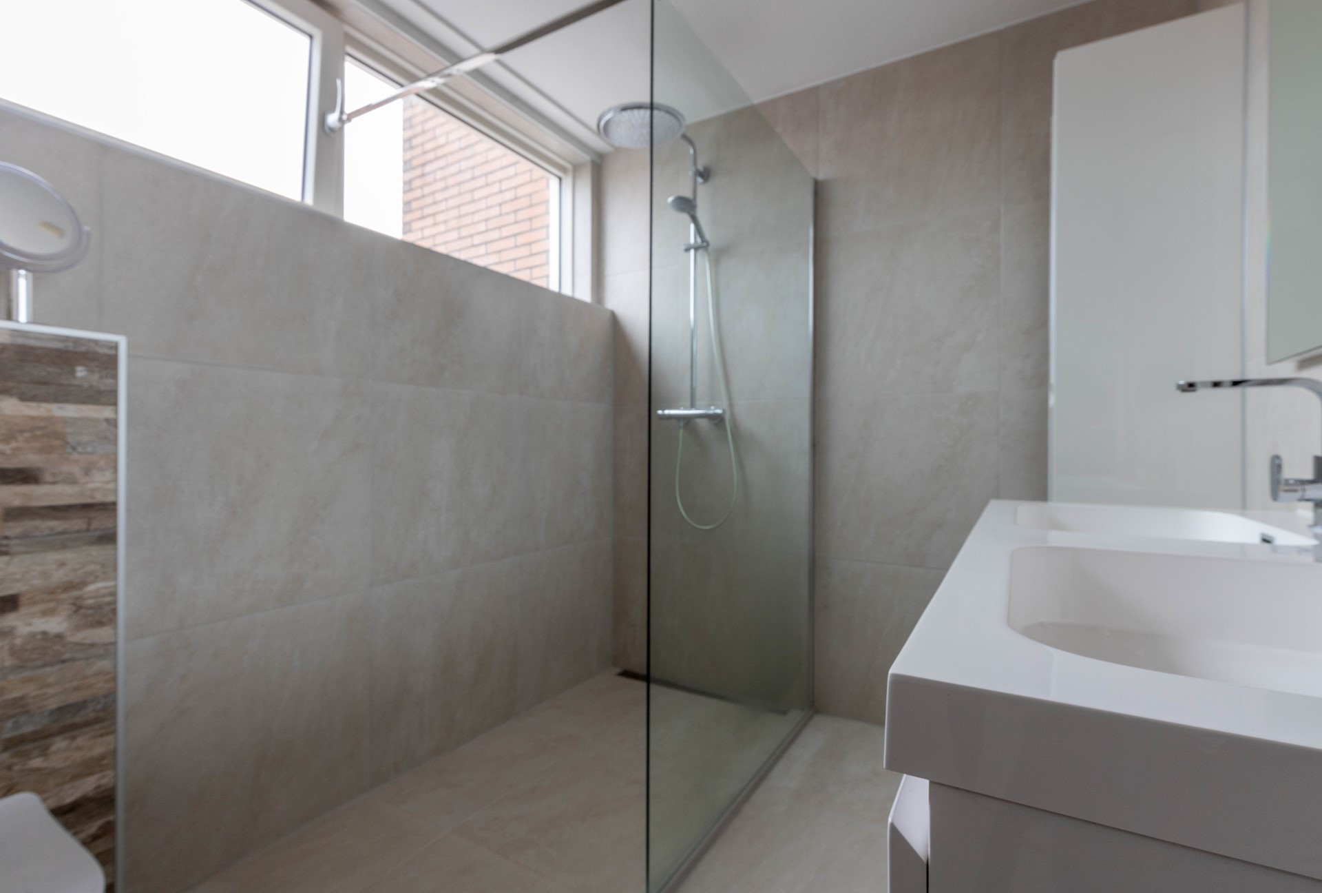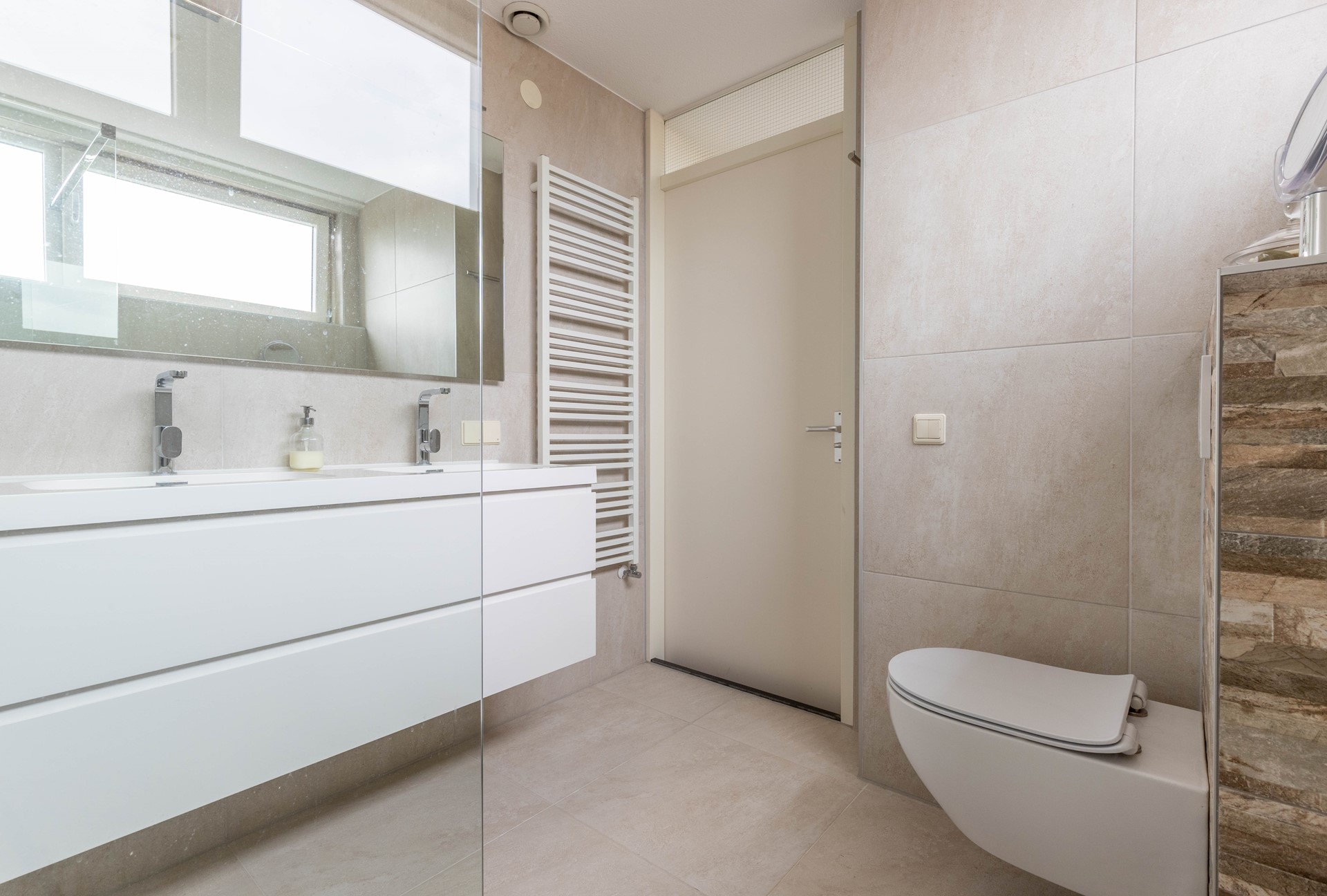 Op het volgende level is de hoofdslaapkamer en badkamer te vinden. In de slaapkamer ligt vloerbedekking. De badkamer is in 2016 vernieuwd en beschikt over een inloopdouche, Geberit wandcloset en dubbele wastafel in meubel.
