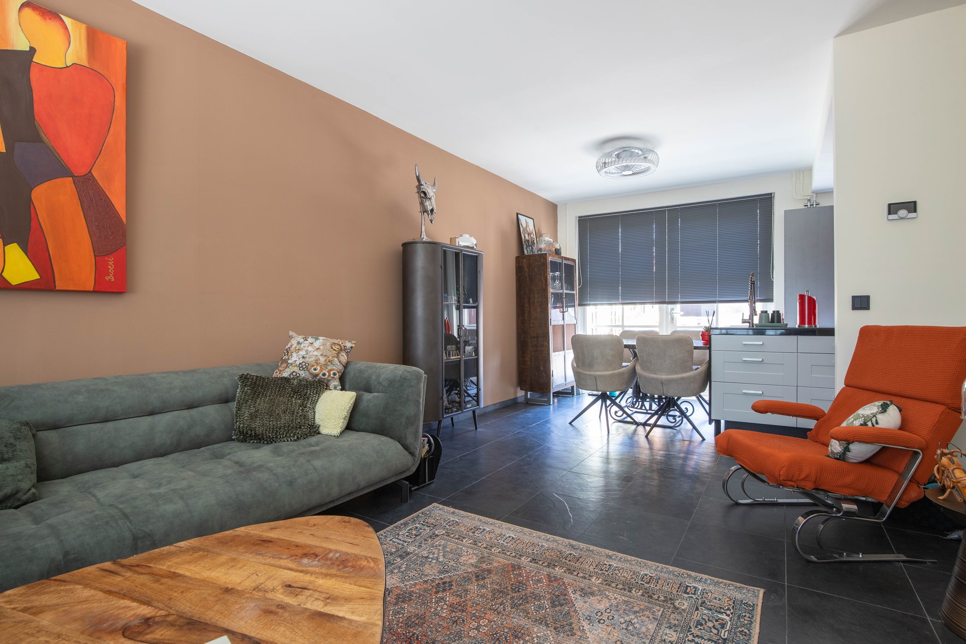 De woonkamer heeft een open karakter en voelt ruim en comfortabel aan door de strakke afwerking en de grote raampartijen. De neutrale kleuren op de wanden in combinatie met de warme vloer geven de ruimte een eigentijdse, maar tegelijk gezellige uitstraling. Er is voldoende plek voor een royale zithoek én een eettafel.