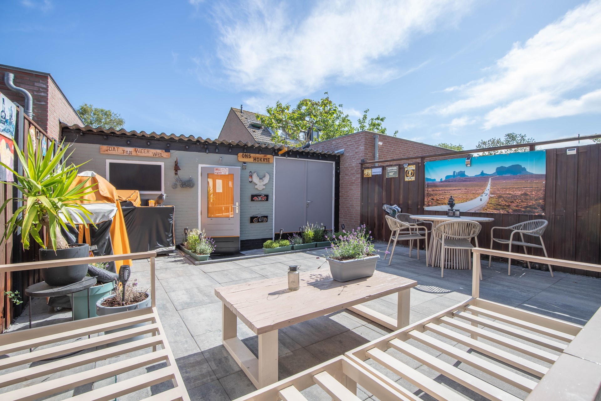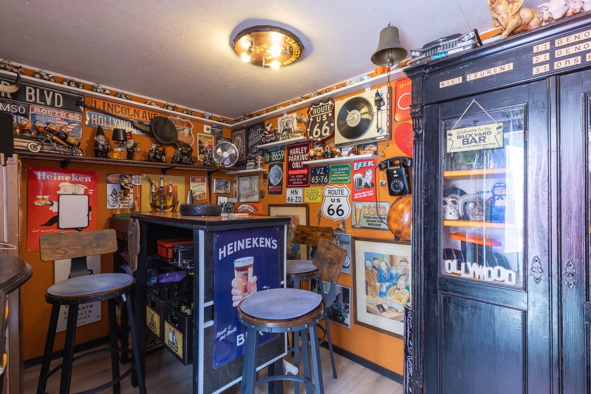 Achterin de tuin staat een vrijstaande, volledig geïsoleerde berging met overkapping en afsluitbare fietsenstalling. Hierdoor is een knusse, beschutte patio-achtige setting ontstaan waar je volop privacy hebt. Eén van de ruimtes in de berging is ingericht als bar, een ideale plek voor een gezellige borrel of thema-avond. Uiteraard leent de berging zich ook uitstekend voor extra opslagruimte of een hobbyruimte.