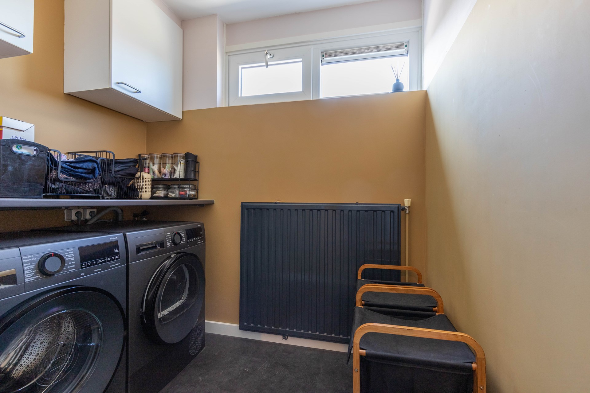 Verder is er een aparte wasruimte met aansluitingen voor wasmachine en droger. De gehele verdieping is strak afgewerkt: gestucte wanden en plafonds, gecombineerd met een moderne laminaatvloer.