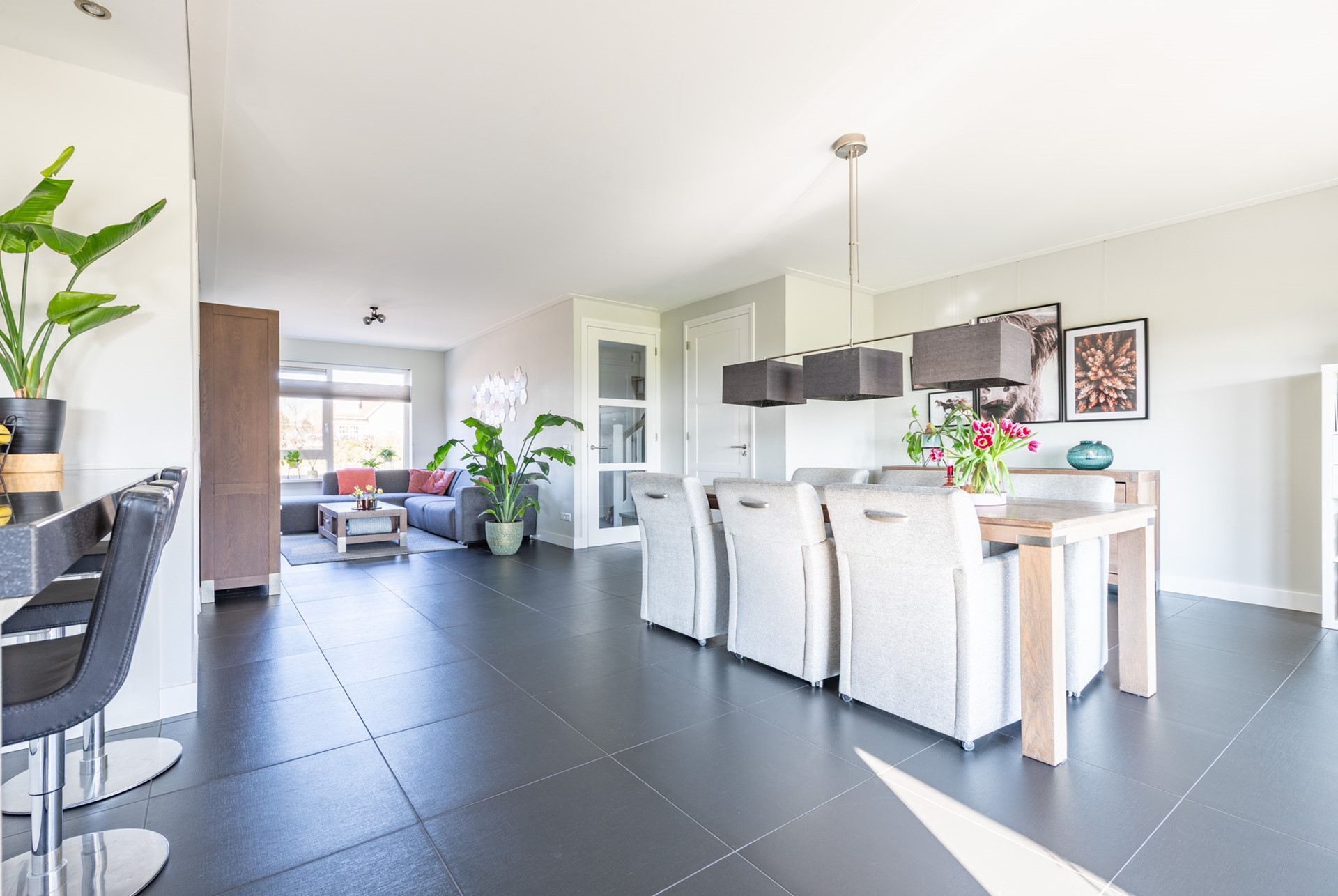 De woonkamer is royaal en staat in open verbinding met de keuken, waardoor een prettige en lichte leefruimte ontstaat. Aan de achterzijde zorgen de grote raampartijen en openslaande deuren voor veel daglicht en een prachtig zicht op de tuin en het achtergelegen polderlandschap.