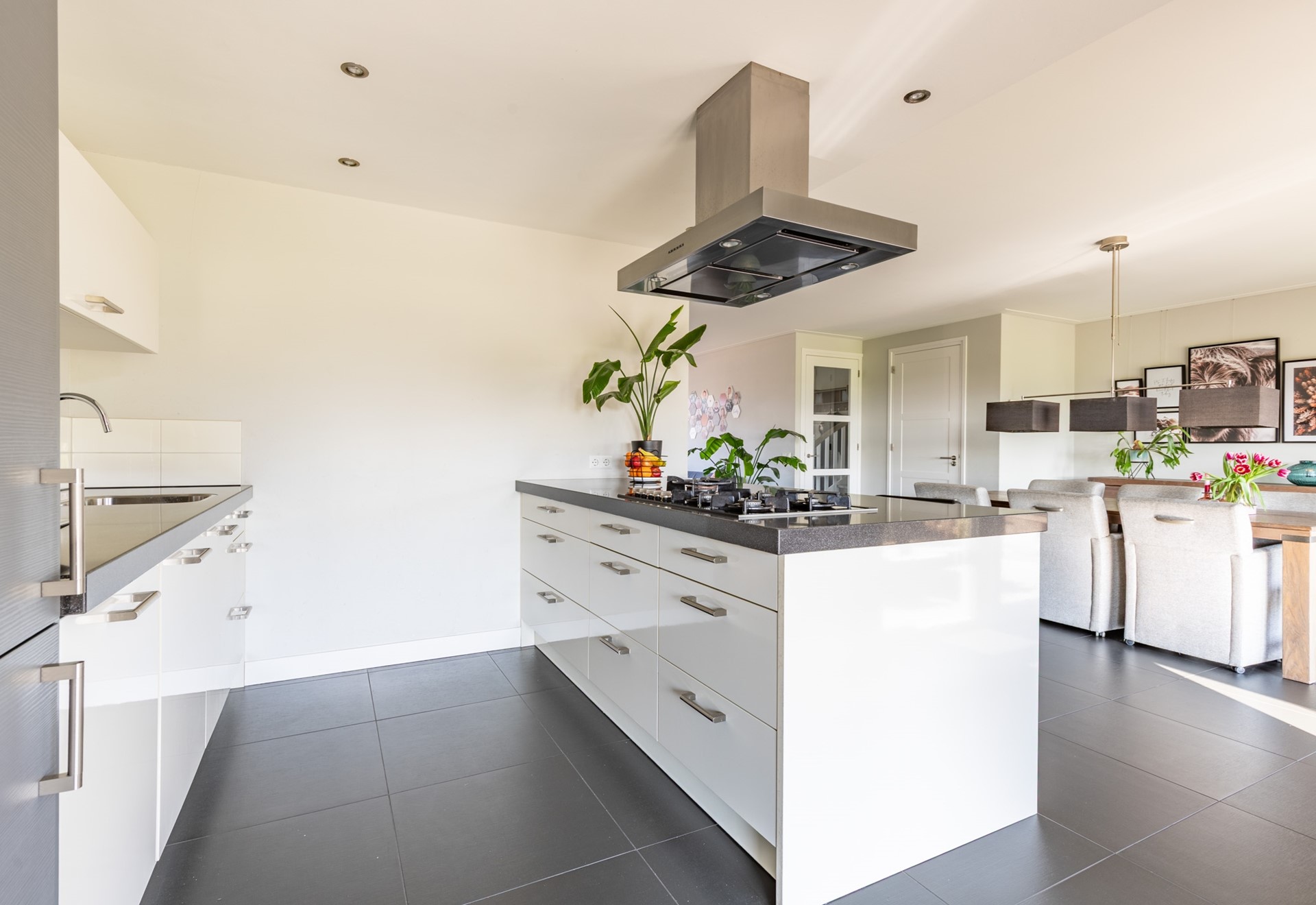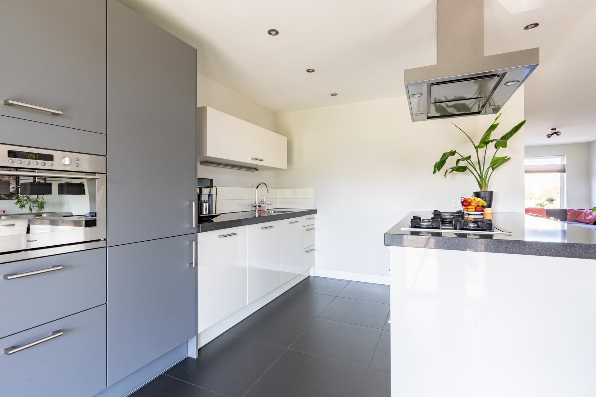 De open keuken is aan de tuinzijde gesitueerd en uitgevoerd met een modern kookeiland met barfunctie, veel kastruimte en diverse inbouwapparatuur. Vanuit de keuken is er direct toegang tot de tuin.