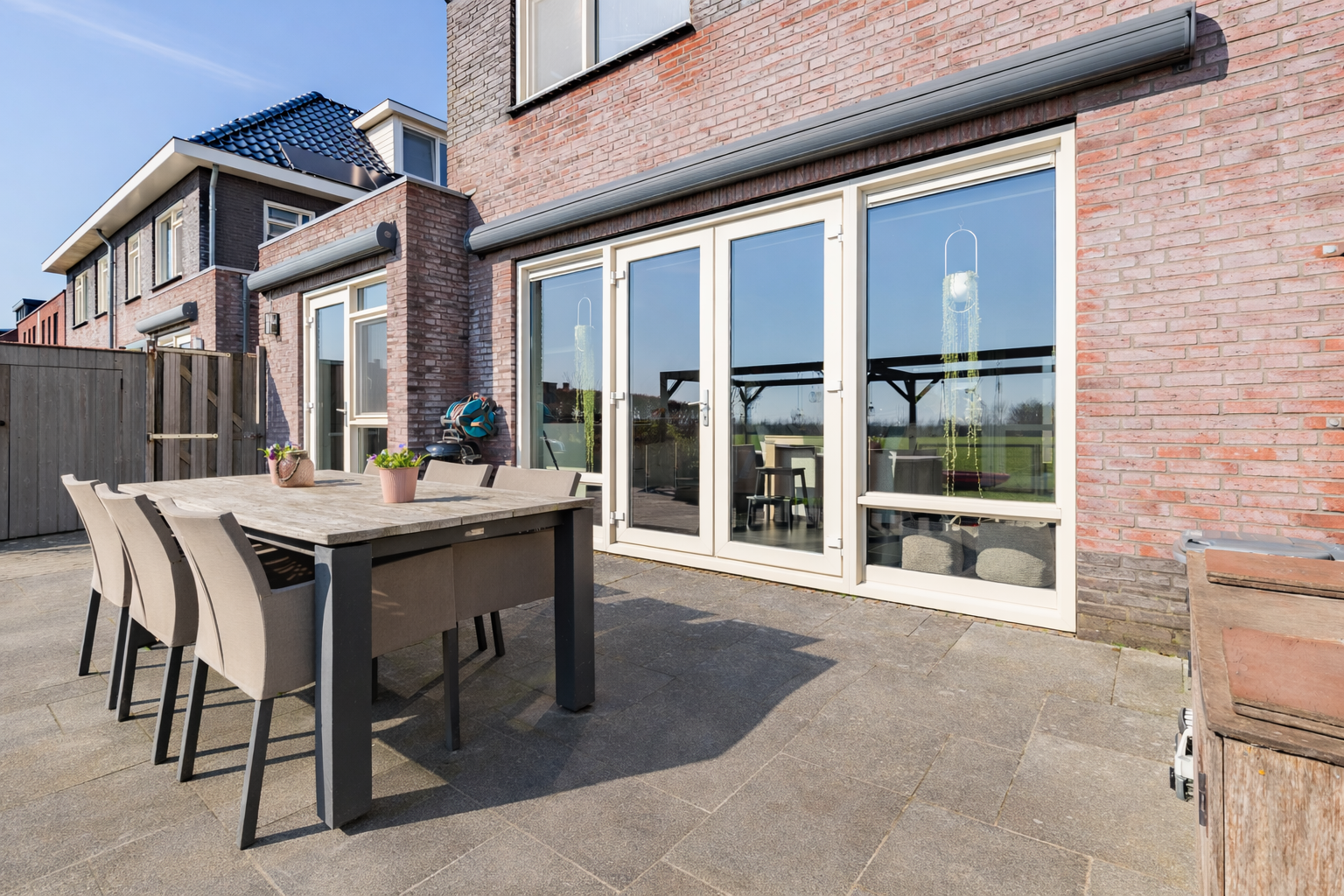 - Achtertuin op het zuiden met meerdere terrassen en vrij uitzicht over weilanden