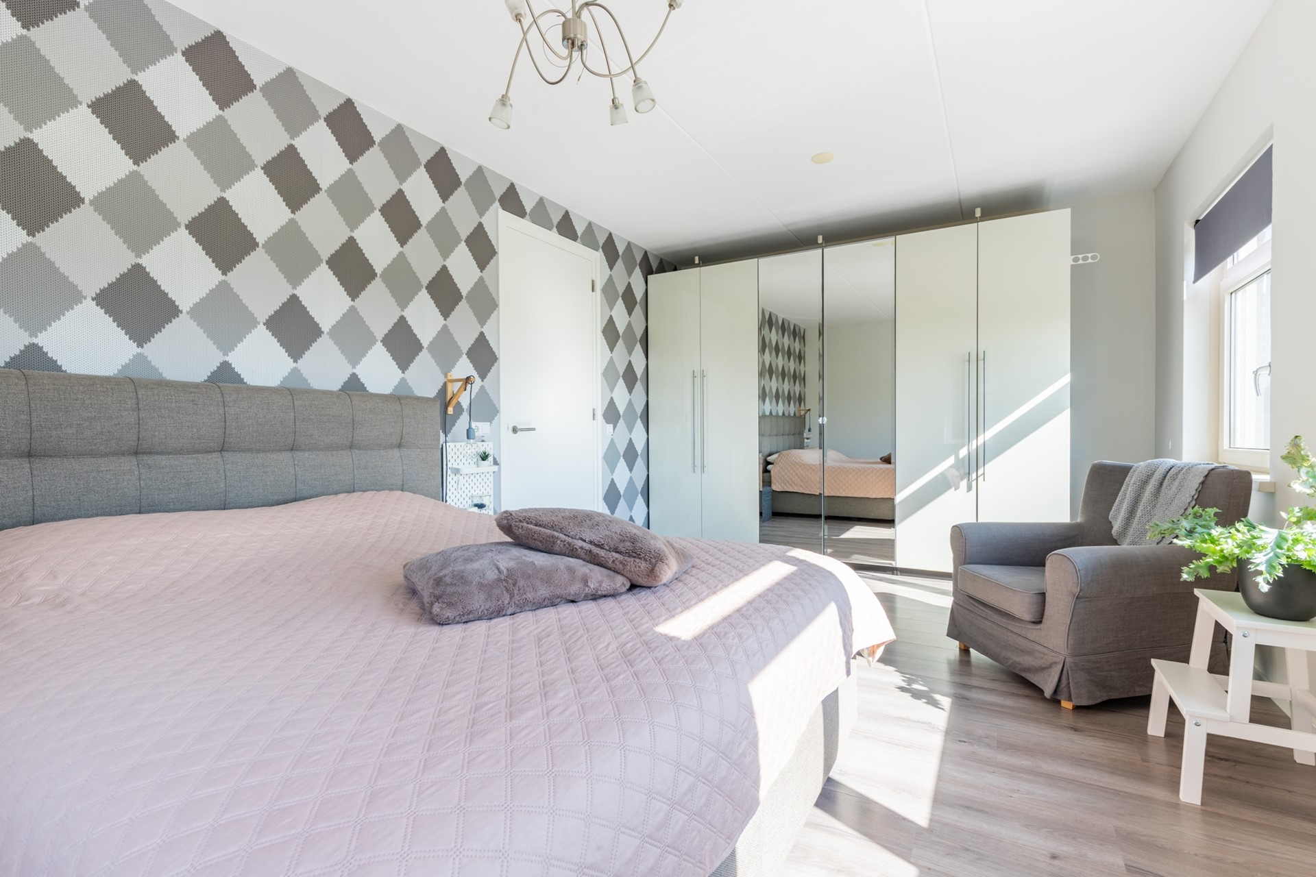 De royale hoofdslaapkamer bevindt zich aan de achterzijde van de woning en is bijzonder licht dankzij de grote raampartijen. Vanuit deze kamer geniet u van een prachtig vrij uitzicht over de achtergelegen polder, wat zorgt voor een gevoel van rust en ruimte. De kamer biedt bovendien volop plek voor een grote kastenwand.