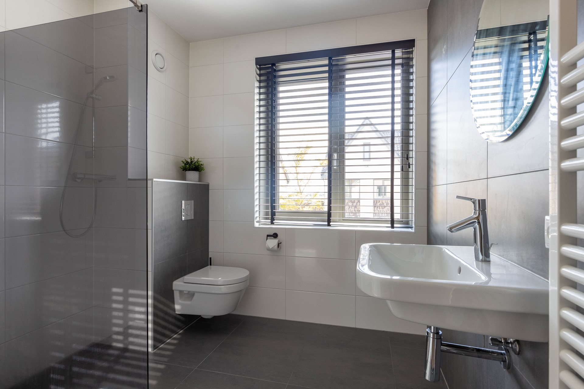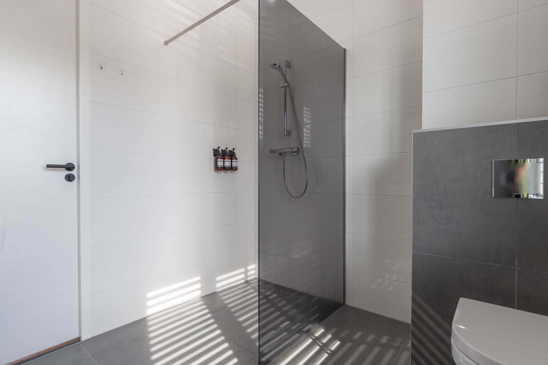 De luxe badkamer (2023) is volledig betegeld en uitgevoerd met een ruime inloopdouche, stijlvol wastafelmeubel en zwevend toilet. De moderne uitstraling en het gebruik van hoogwaardige materialen maken dit een fijne en praktische ruimte.