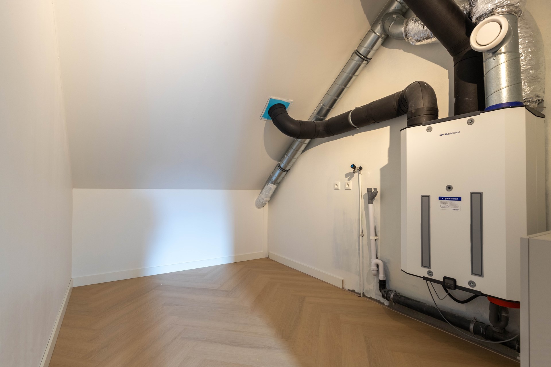 Daarnaast is er een separate was- en stookruimte, uitgerust met aansluitingen voor zowel wasmachine als droger. Hier bevinden zich ook de moderne installaties van de bodemwarmtepomp en de WTW-unit. Dankzij de slimme indeling biedt deze ruimte niet alleen praktische voorzieningen, maar ook opvallend veel bergruimte.