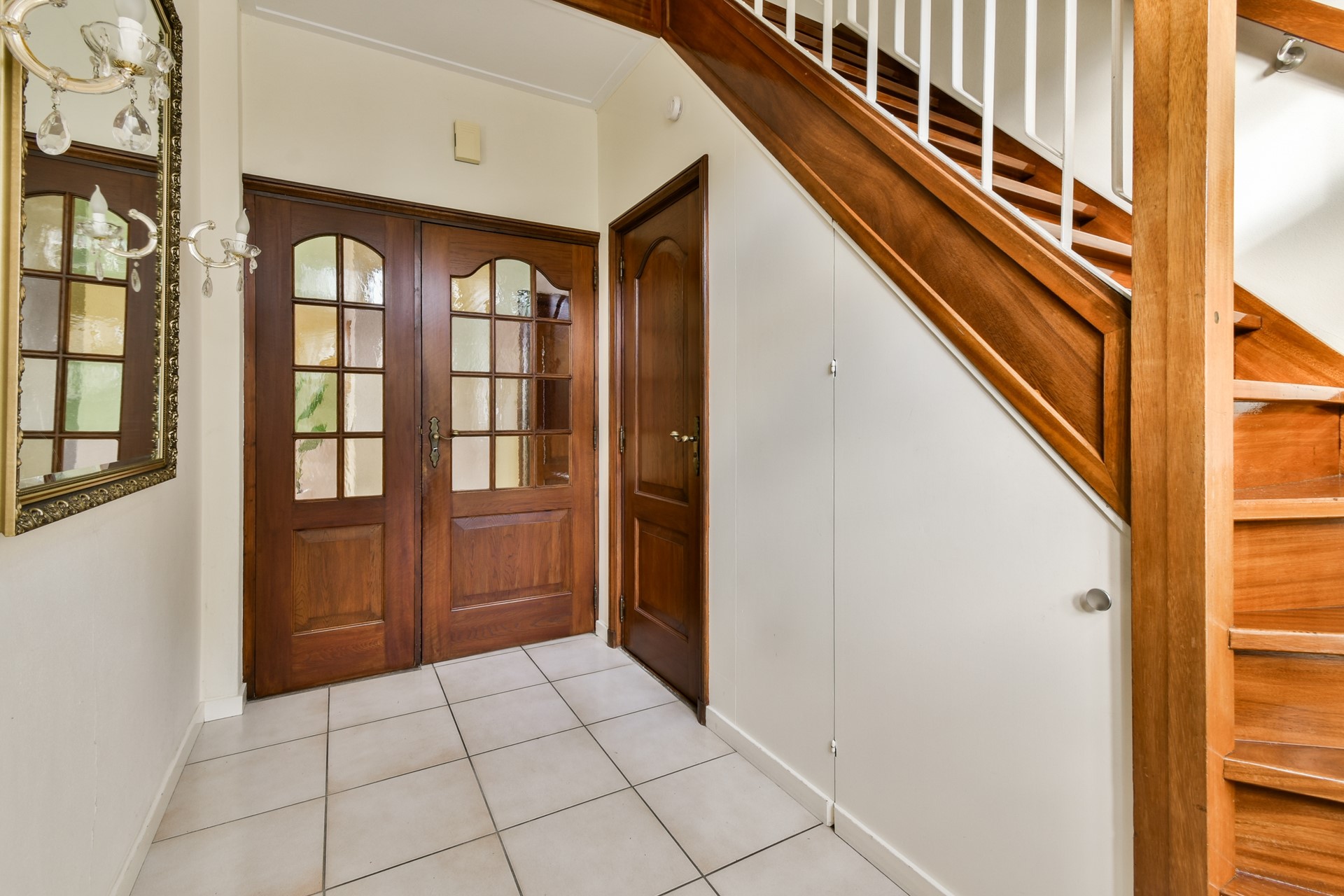 De voortuin is voorzien van sierbestrating en plantenborders. Via de overdekte entree is er toegang tot de hal met garderobe, vide en een toiletruimte met toilet en fonteintje.
