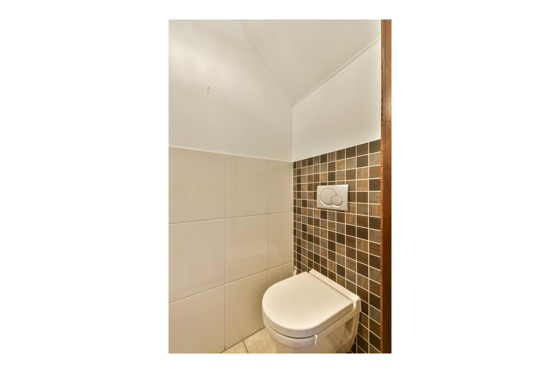 De volledig betegelde, complete badkamer is voorzien van een vrijhangend toilet, een ligbad, een designradiator, een hoekdouche met douchecabine, een wastafel in een badkamermeubel en aansluitingen voor zowel de wasmachine als de droger.