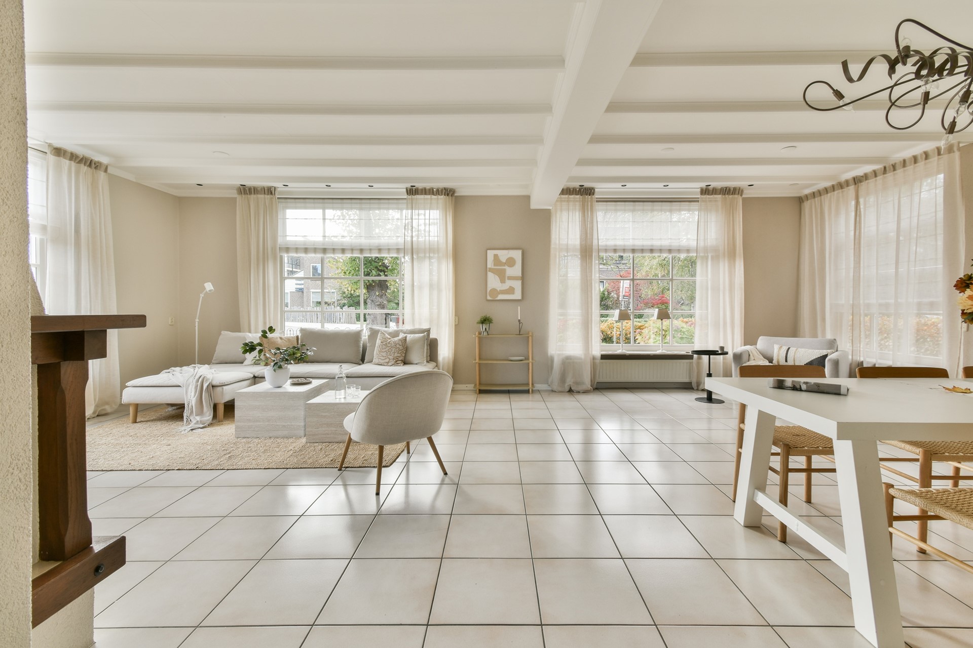 De ruime woonkamer is aan de voorzijde gelegen en heeft een fijne woonsfeer, mede dankzij de sfeervolle open haard. De grote raampartijen zorgen voor veel natuurlijk licht in de woning.
