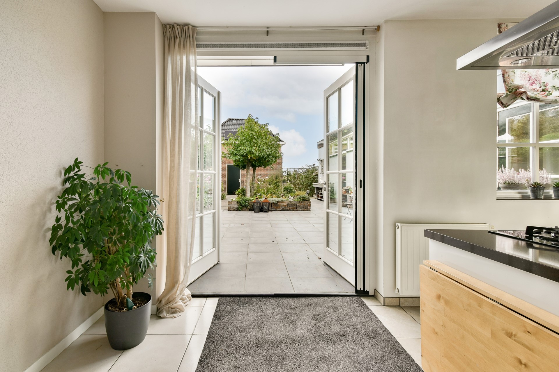 De halfopen keuken is aan de tuinzijde gelegen en voorzien van een moderne L-vormige opstelling met een hardstenen werkblad en diverse inbouwapparatuur. Het aanwezige kookeiland beschikt over een 5-pits gaskookplaat en een RVS-afzuigkap en wordt tevens gebruikt als zitbar. Vanuit de keuken bieden openslaande deuren toegang tot de grote, zonnige tuin met sierbestrating, borders en diverse terrassen. Vanuit de tuin is er toegang tot het grote bijgebouw en de vrijstaande garage aan de achterzijde.